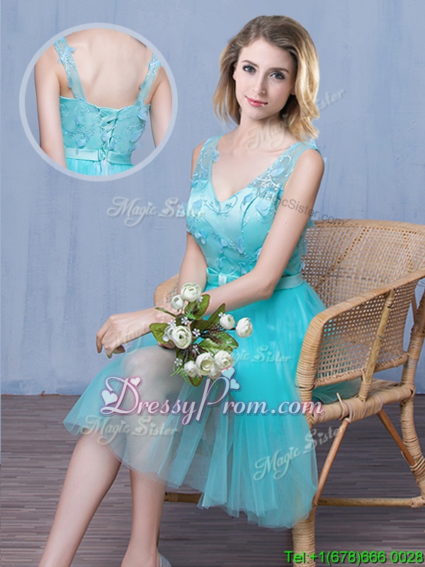 Neckline : V-neckShown Color : Aqua BlueSilhouette : EmpireSleeve Length : sleevelessHemline : knee lengthBack Detail : Lace upFabric : TulleEmbellishment : Lace,Appliques,BowknotOccasion : Prom,PartySeason : Spring,Summer,Fall