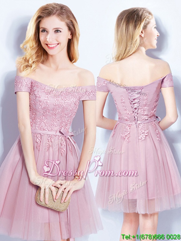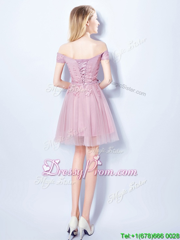 Neckline : Off the shoulder Shown Color : Pink Silhouette : Empire Sleeve Length : sleeveless Hemline : mini length Back Detail : Lace up Fabric : Tulle Embellishment : Appliques,Belt Occasion : Prom,Party,Wedding Party Season : Spring,Summer,Fall