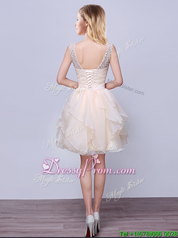 Neckline : ScoopShown Color : ChampagneSilhouette : A-lineSleeve Length : sleevelessHemline : high lowBack Detail : Lace upFabric : OrganzaEmbellishment : Lace,RufflesOccasion : Prom,Party,Wedding PartySeason : Spring,Summer,Fall