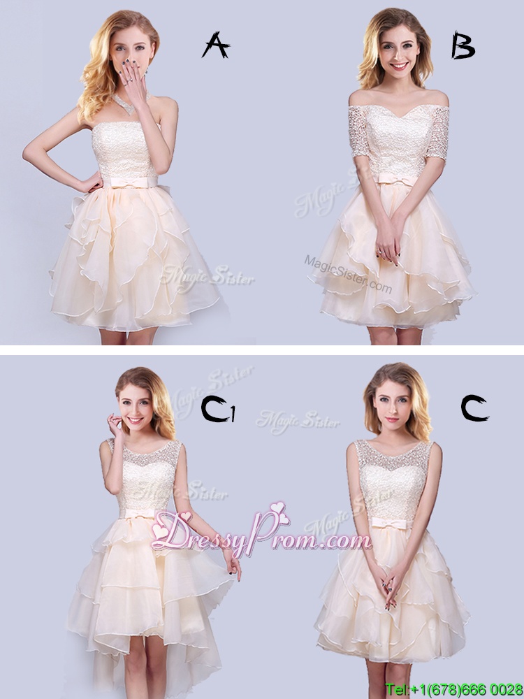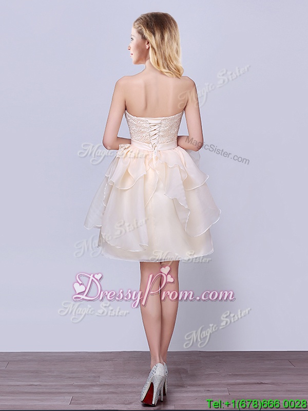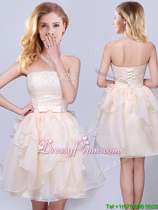 Neckline : StraplessShown Color : ChampagneSilhouette : A-lineSleeve Length : sleevelessHemline : mini lengthBack Detail : Lace upFabric : OrganzaEmbellishment : Lace,Ruffles,BeltOccasion : Prom,Party,Wedding PartySeason : Spring,Summer,Fall