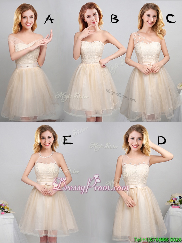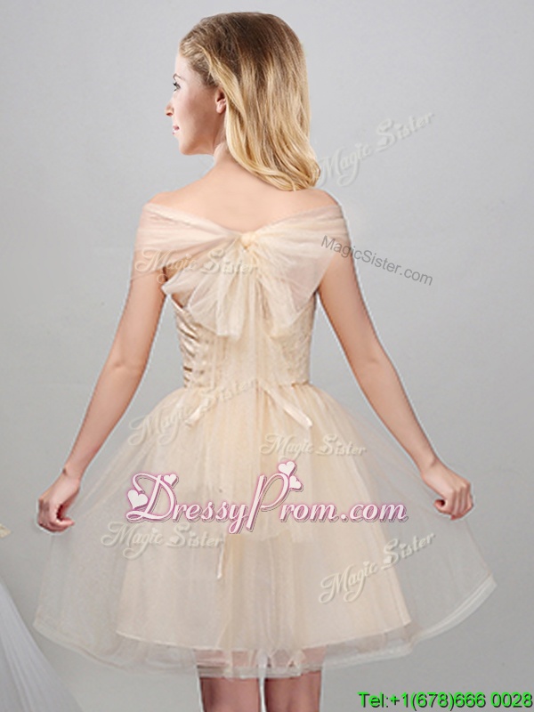 Neckline : Off the shoulder Shown Color : Champagne Silhouette : A-line Sleeve Length : short sleeves Hemline : mini length Back Detail : Lace up Fabric : Tulle Embellishment : Lace,Appliques,Belt Occasion : Prom,Party,Wedding Party Season : Spring,Summer,Fall