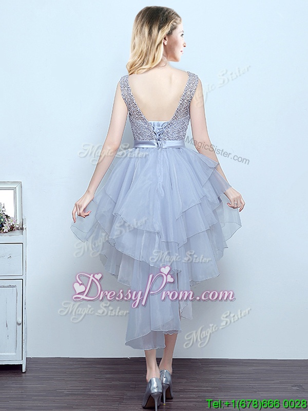 Neckline : ScoopShown Color : GreySilhouette : A-lineSleeve Length : sleevelessHemline : high lowBack Detail : Lace upFabric : Organza,LaceEmbellishment : Lace,Ruffles,BeltOccasion : Prom,Party,Wedding PartySeason : Spring,Summer,Fall