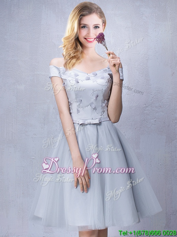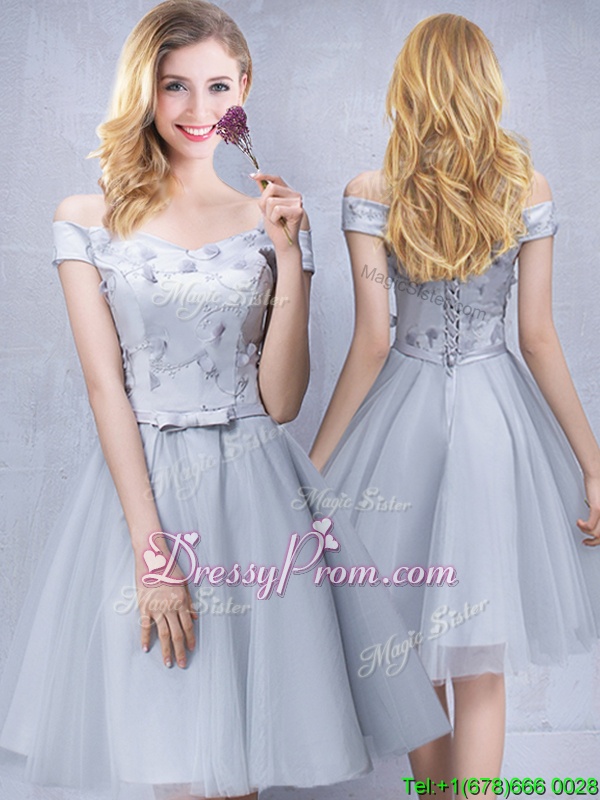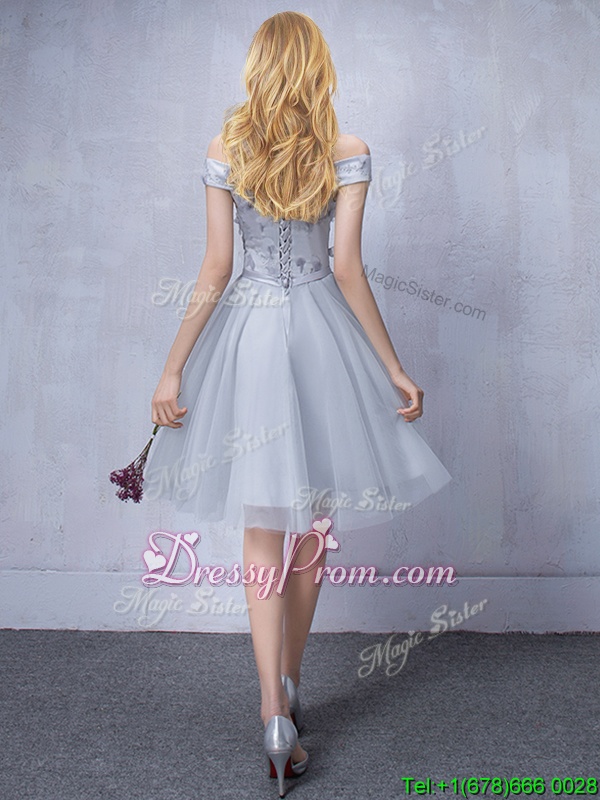Neckline : Off the shoulderShown Color : GreySilhouette : A-lineSleeve Length : sleevelessHemline : knee lengthBack Detail : Lace upFabric : TulleEmbellishment : Appliques,BeltOccasion : Prom,Party,Wedding PartySeason : Spring,Summer,Fall