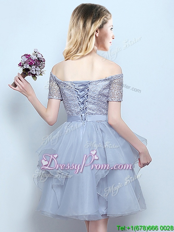 Suitable Mini Length Grey Dama Dress for Quinceanera Off The Shoulder Short Sleeves Lace Up