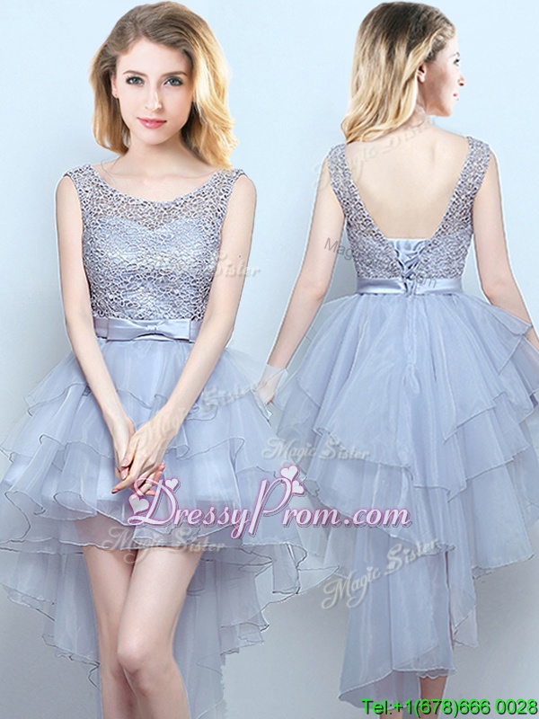 Neckline : Off the shoulder Shown Color : Grey Silhouette : A-line Sleeve Length : sleeveless Hemline : mini length Back Detail : Lace up Fabric : Organza Embellishment : Lace,Ruffles,Belt Occasion : Prom,Party,Wedding Party Season : Spring,Summer,Fall