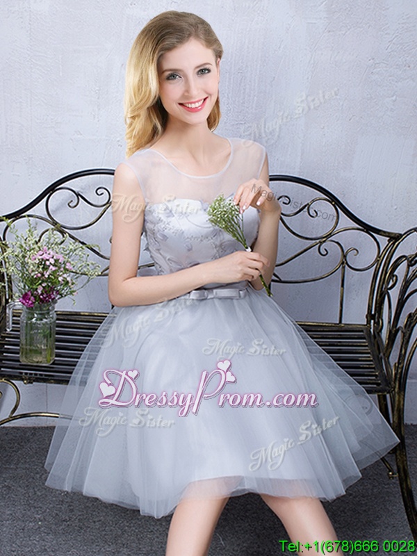 Scoop Sleeveless Tulle Knee Length Lace Up Quinceanera Court Dresses in Grey for with Lace and Appliques and Belt