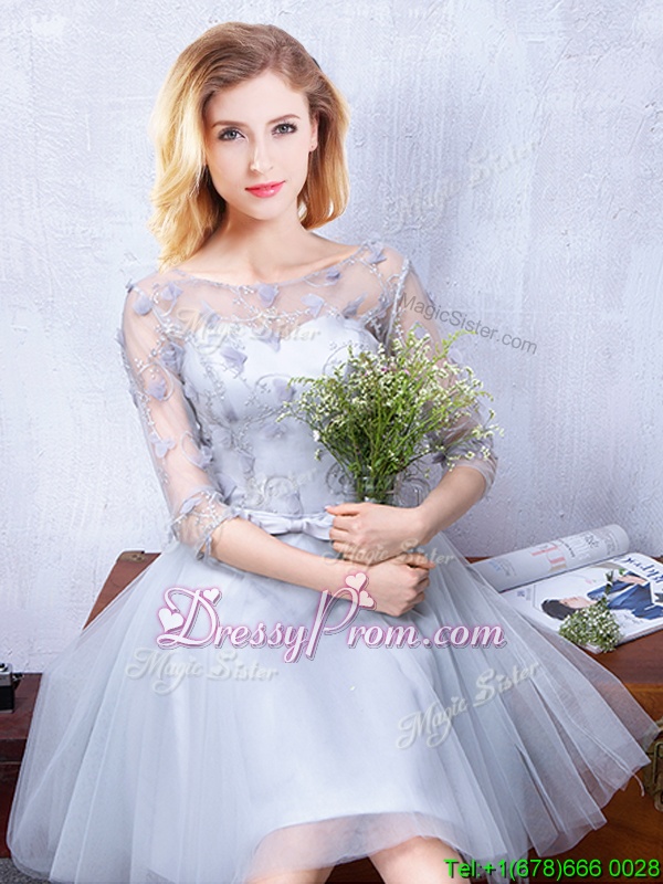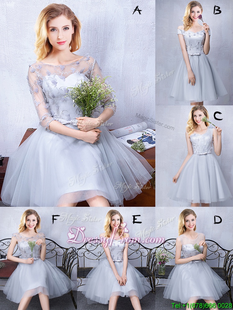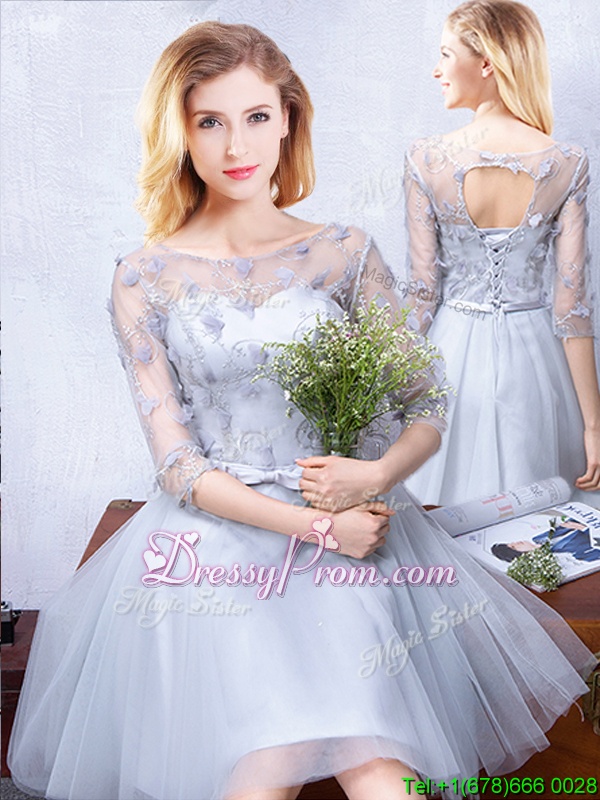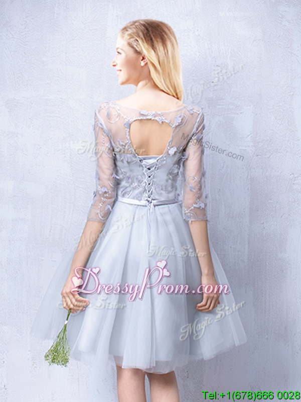 Neckline : ScoopShown Color : GreySilhouette : A-lineSleeve Length : half sleevesHemline : knee lengthBack Detail : Lace upFabric : TulleEmbellishment : Lace,Appliques,BeltOccasion : Prom,Party,Wedding PartySeason : Spring,Summer,Fall
