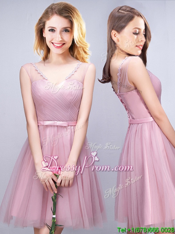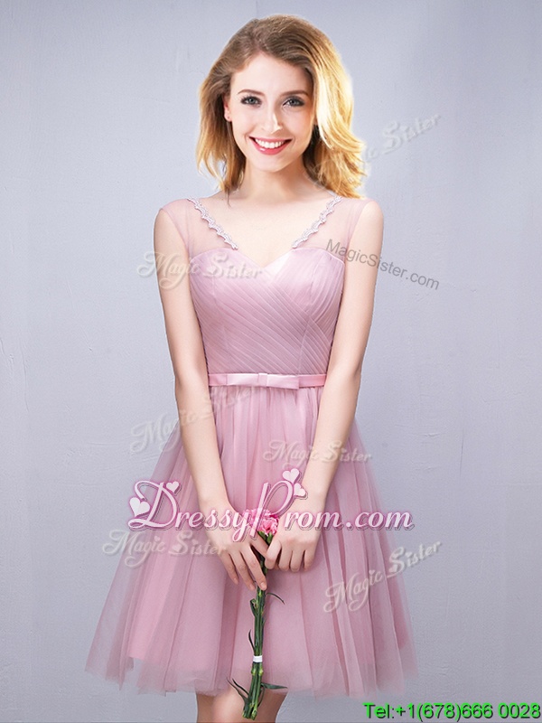 Neckline : V-neckShown Color : PinkSilhouette : A-lineSleeve Length : sleevelessHemline : mini lengthBack Detail : Lace upFabric : TulleEmbellishment : Ruching,BowknotOccasion : Prom,Party,Wedding PartySeason : Spring,Summer,Fall