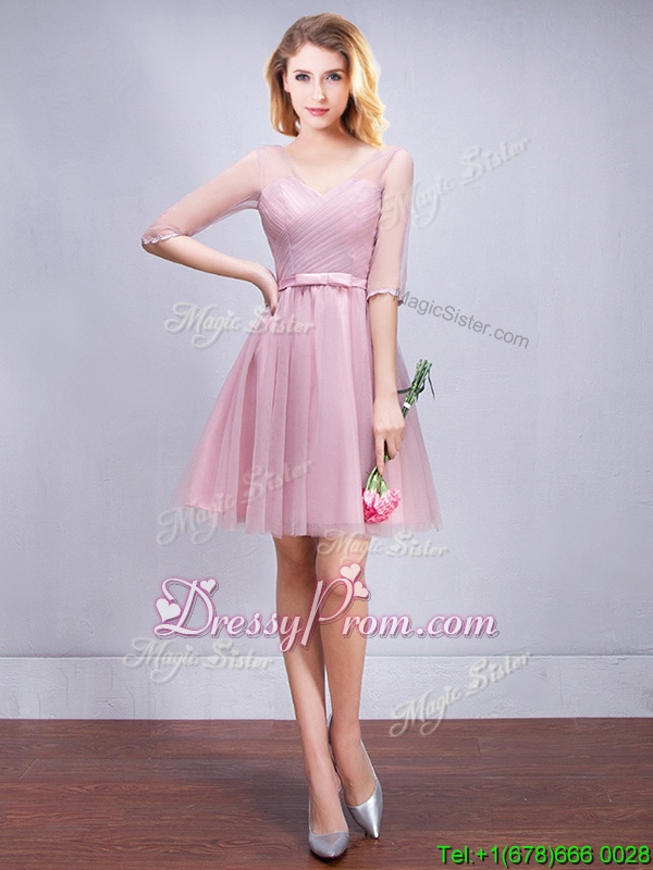 Neckline : V-neckShown Color : PinkSilhouette : A-lineSleeve Length : half sleevesHemline : mini lengthBack Detail : Lace upFabric : TulleEmbellishment : Ruching,BowknotOccasion : Prom,Party,Wedding PartySeason : Spring,Summer,Fall