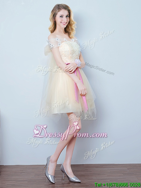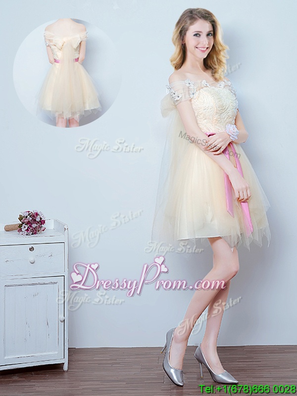 Neckline : Off the shoulder Shown Color : Champagne Silhouette : A-line Sleeve Length : short sleeves Hemline : mini length Back Detail : Lace up Fabric : Tulle Embellishment : Lace,Appliques,Ruffles,Bowknot Occasion : Prom,Party,Wedding Party Season : Spring,Summer,Fall