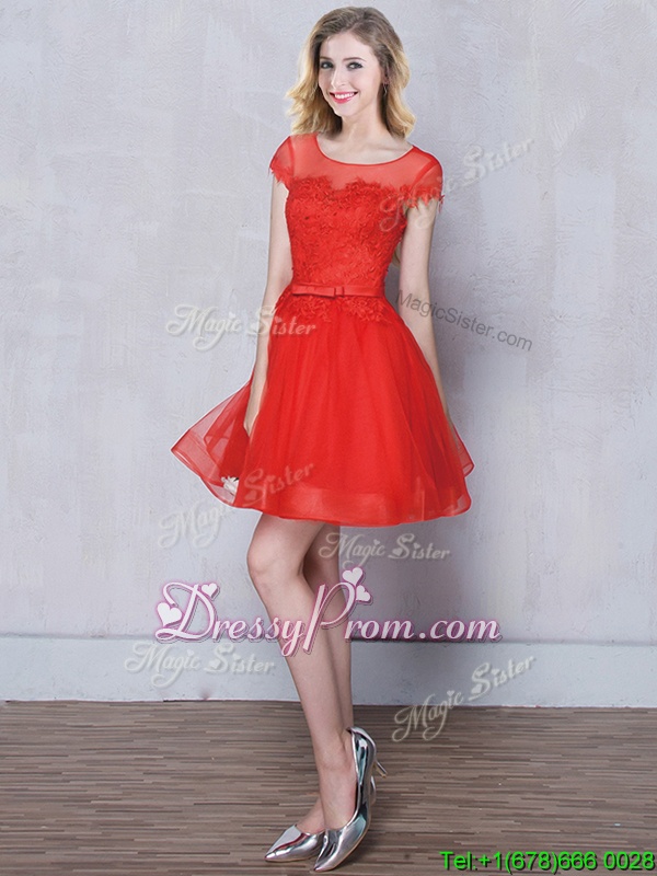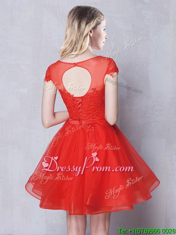 Neckline : Scoop Shown Color : Red Silhouette : A-line Sleeve Length : short sleeves Hemline : mini length Back Detail : Lace up Fabric : Tulle Embellishment : Appliques,Belt Occasion : Prom,Party,Wedding Party Season : Spring,Summer,Fall