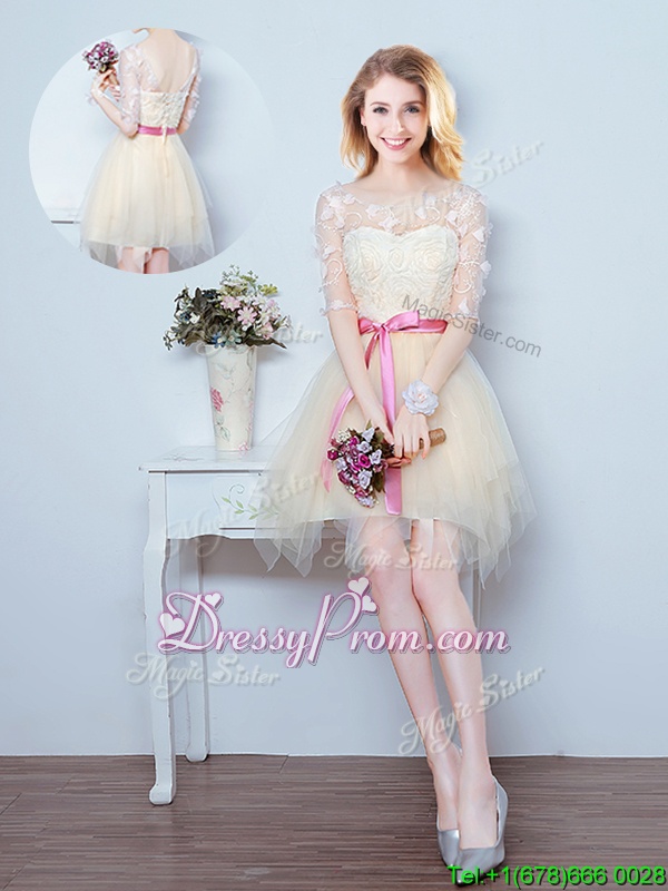Neckline : ScoopShown Color : ChampagneSilhouette : A-lineSleeve Length : sleevelessHemline : mini lengthBack Detail : Lace upFabric : TulleEmbellishment : Lace,Appliques,Ruffles,BowknotOccasion : Prom,Party,Wedding PartySeason : Spring,Summer,Fall