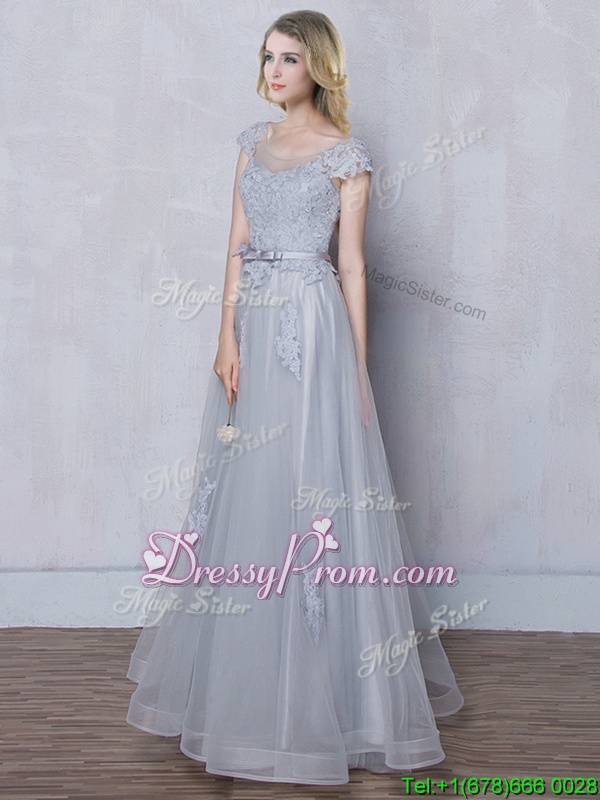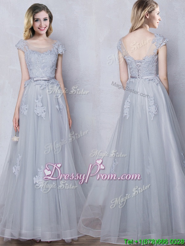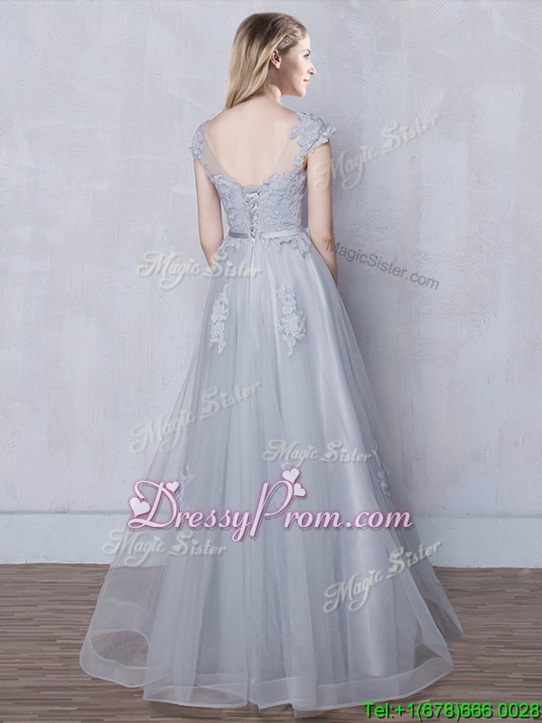 Neckline : ScoopShown Color : GreySilhouette : EmpireSleeve Length : cap sleevesHemline : floor lengthBack Detail : Lace upFabric : TulleEmbellishment : Lace,Appliques,BeltOccasion : Prom,Party,Wedding PartySeason : Spring,Summer,Fall