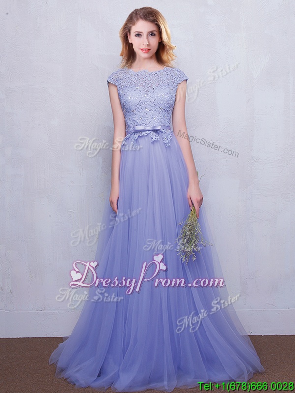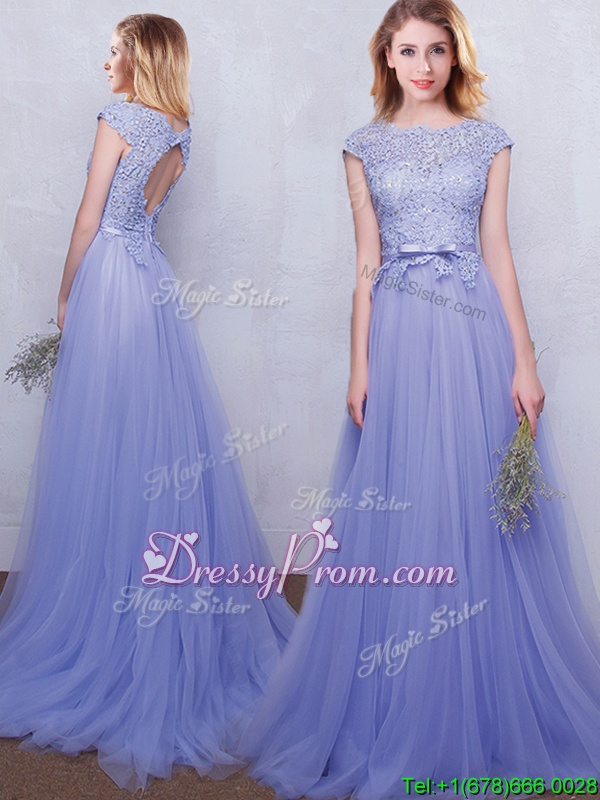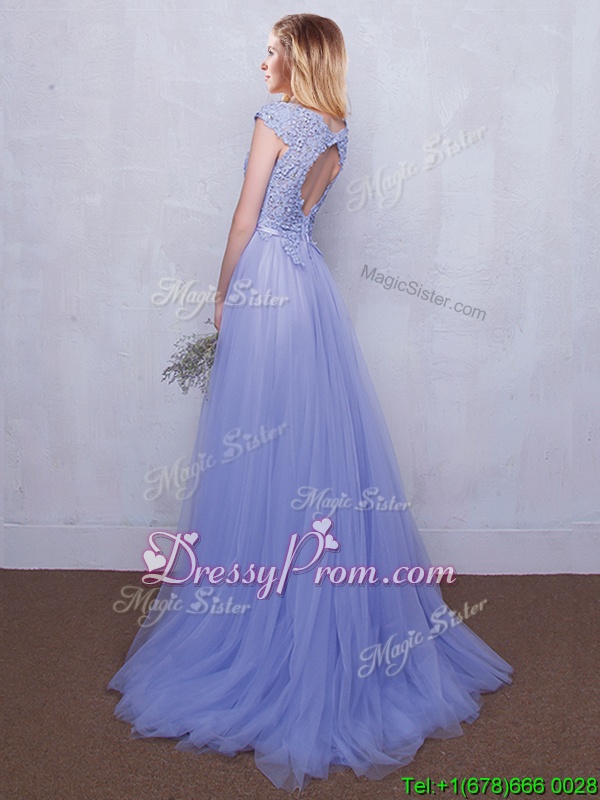 Neckline : ScoopShown Color : LavenderSilhouette : EmpireSleeve Length : cap sleevesHemline : with trainBack Detail : BacklessFabric : TulleEmbellishment : Lace,BeltOccasion : Prom,Party,Wedding PartySeason : Spring,Summer,Fall,Winter