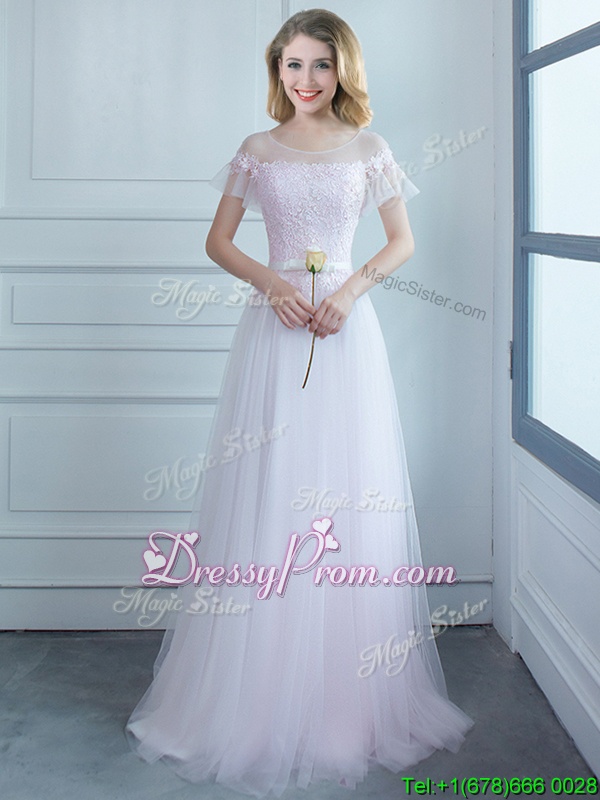 Neckline : Scoop Shown Color : White Silhouette : Empire Sleeve Length : short sleeves Back Detail : Lace up Fabric : Tulle Embellishment : Lace,Belt Occasion : Prom,Party,Wedding Party Season : Spring,Summer,Fall,Winter