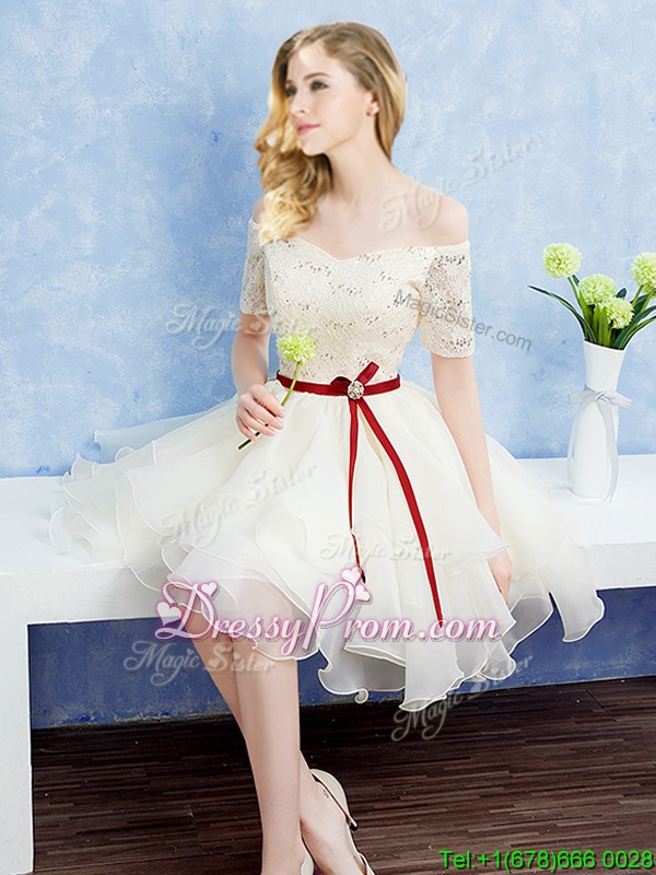 Adorable Off the Shoulder Short Sleeves Lace Up Mini Length Lace and Ruffles and Belt Court Dresses for Sweet 16