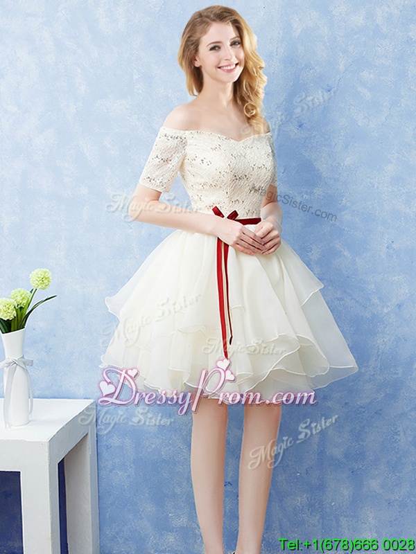 Neckline : Off the shoulder Shown Color : Champagne Silhouette : A-line Sleeve Length : short sleeves Hemline : mini length Back Detail : Lace up Fabric : Organza Embellishment : Lace,Ruffles,Belt Occasion : Prom,Party,Wedding Party Season : Spring,Summer,Fall