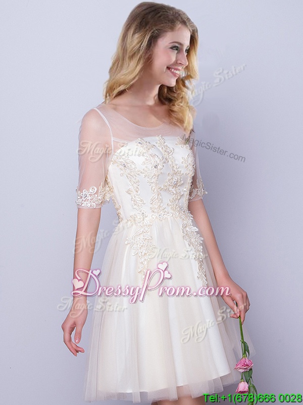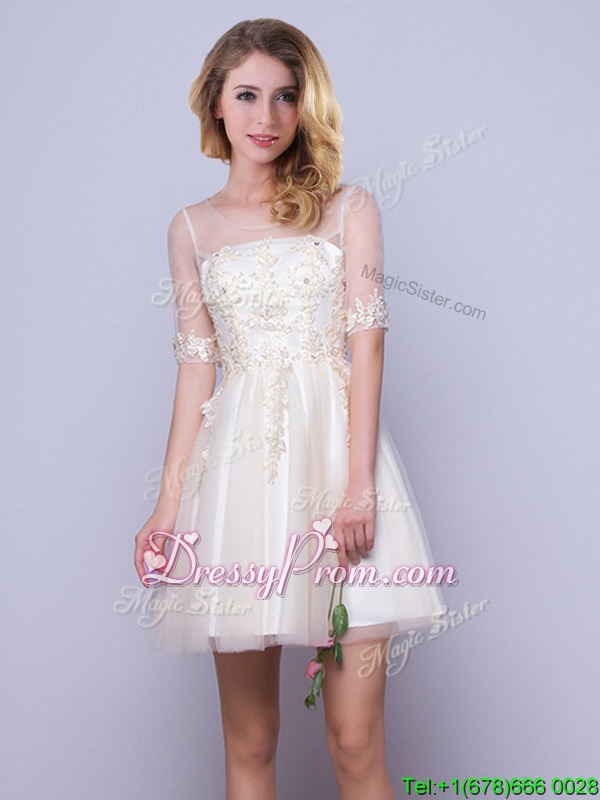 Neckline : ScoopShown Color : ChampagneSilhouette : A-lineSleeve Length : half sleevesHemline : mini lengthBack Detail : Lace upFabric : TulleEmbellishment : AppliquesOccasion : Prom,Party,Wedding PartySeason : Spring,Summer,Fall