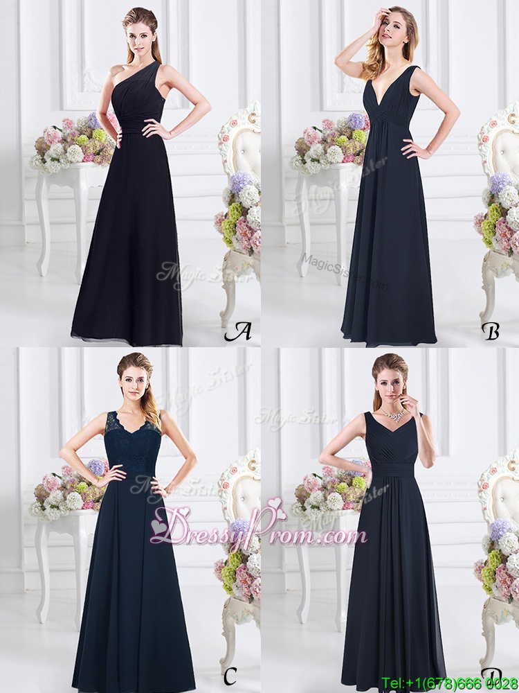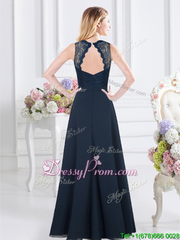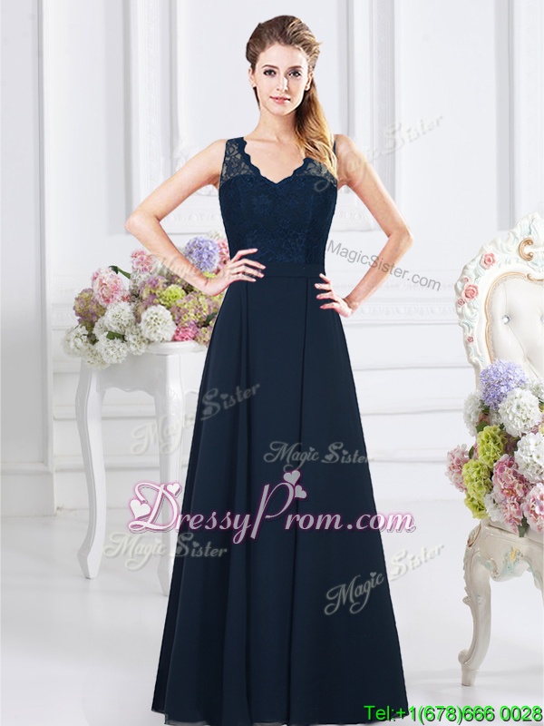 Neckline : V-neckShown Color : Navy BlueSilhouette : EmpireSleeve Length : sleevelessHemline : floor lengthBack Detail : BacklessFabric : ChiffonEmbellishment : Lace,RuchingOccasion : Prom,Party,Wedding PartySeason : Spring,Summer,Fall,Winter