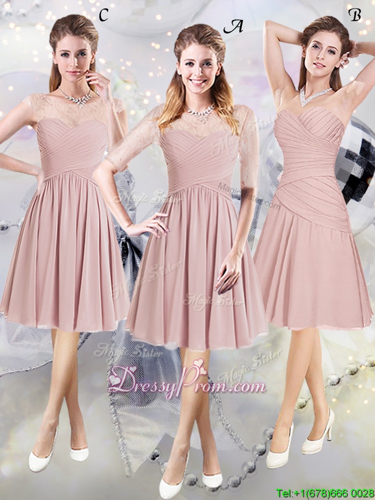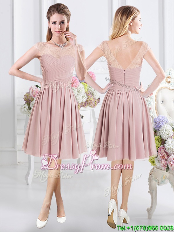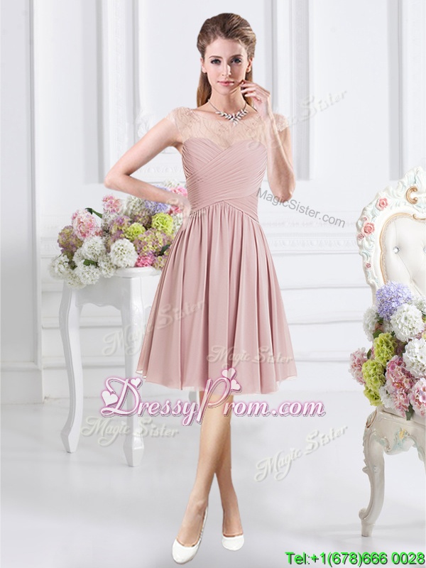 Neckline : ScoopShown Color : PinkSilhouette : A-lineSleeve Length : cap sleevesHemline : knee lengthBack Detail : ZipperFabric : ChiffonEmbellishment : Lace,RuchingOccasion : Prom,Party,Wedding PartySeason : Spring,Summer,Fall