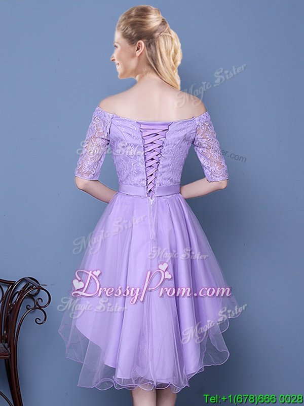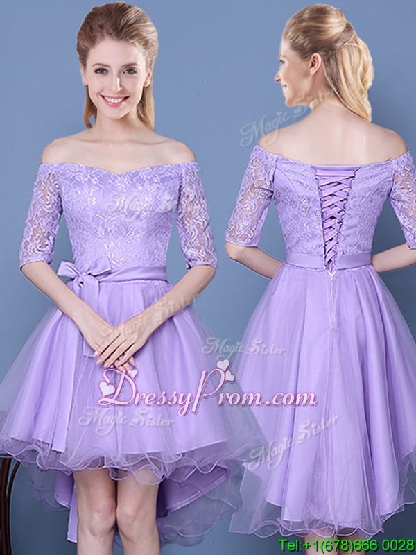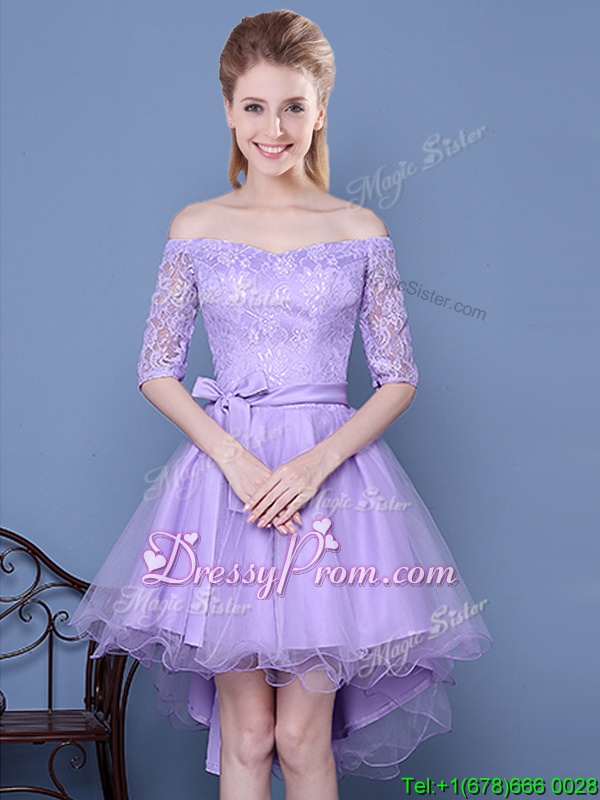 Off the Shoulder Lavender A-line Lace and Bowknot and Belt Quinceanera Court of Honor Dress Lace Up Tulle Half Sleeves High Low