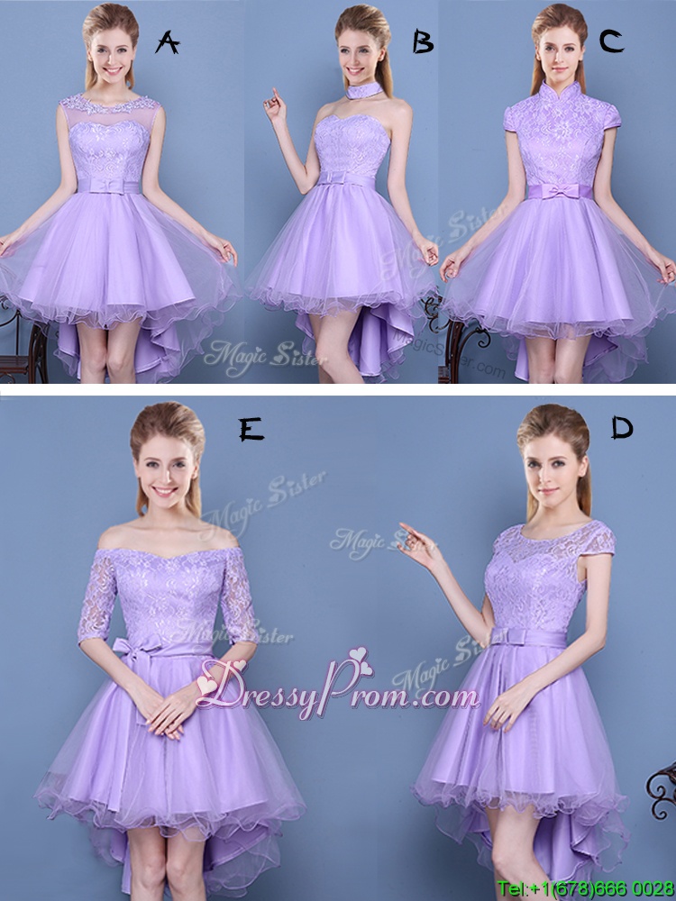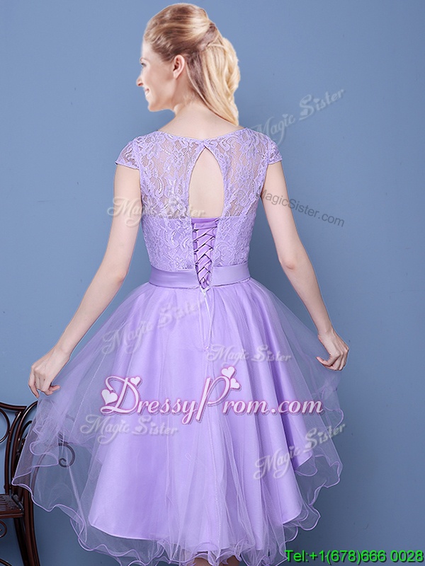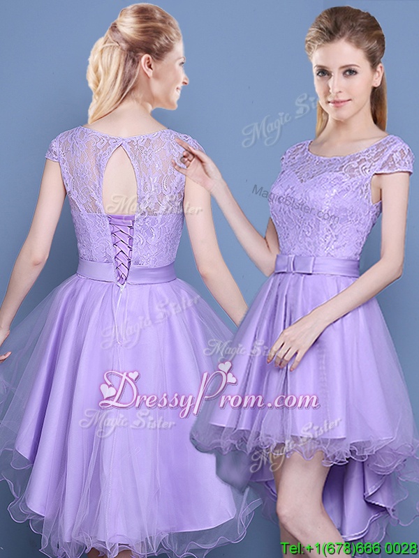 Neckline : ScoopShown Color : LavenderSilhouette : A-lineSleeve Length : cap sleevesHemline : high lowBack Detail : Lace upFabric : TulleEmbellishment : LaceOccasion : Prom,PartySeason : Spring,Summer,Fall
