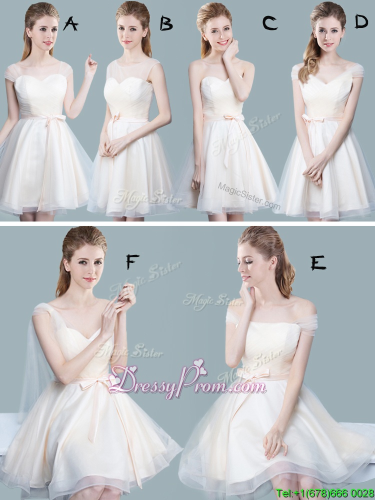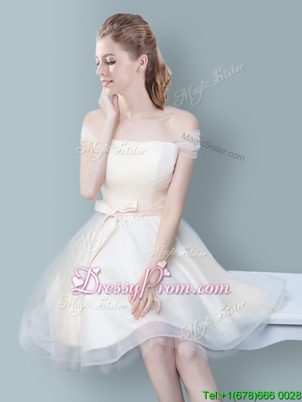 Neckline : Off the shoulderShown Color : ChampagneSilhouette : EmpireSleeve Length : sleevelessHemline : knee lengthBack Detail : ZipperFabric : TulleEmbellishment : Ruching,BowknotOccasion : Prom,Party,Wedding PartySeason : Spring,Summer,Fall