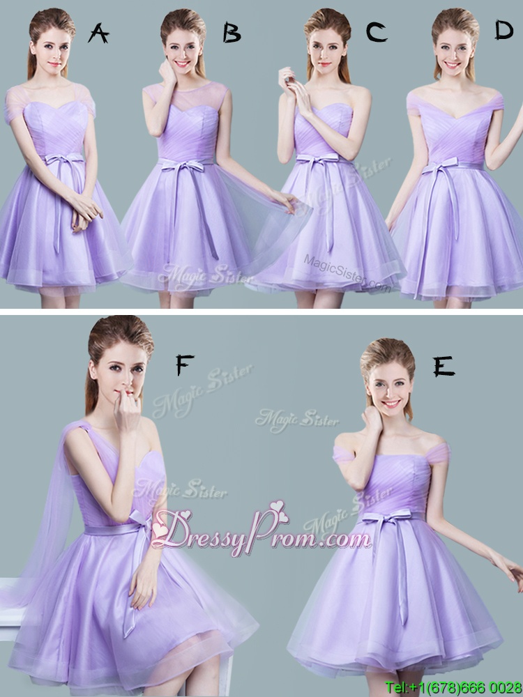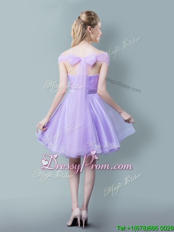 Neckline : V-neckShown Color : LavenderSilhouette : EmpireSleeve Length : cap sleevesHemline : knee lengthBack Detail : ZipperFabric : TulleEmbellishment : Ruching,BowknotOccasion : Prom,Party,Wedding PartySeason : Spring,Summer,Fall