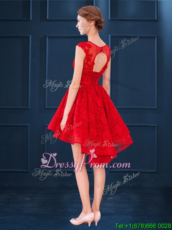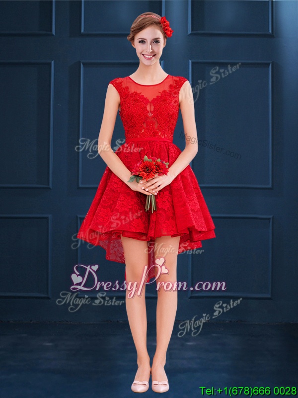 Neckline : ScoopShown Color : RedSilhouette : A-lineSleeve Length : sleevelessHemline : high lowBack Detail : Lace upFabric : LaceEmbellishment : LaceOccasion : Prom,PartySeason : Spring,Summer,Fall,Winter