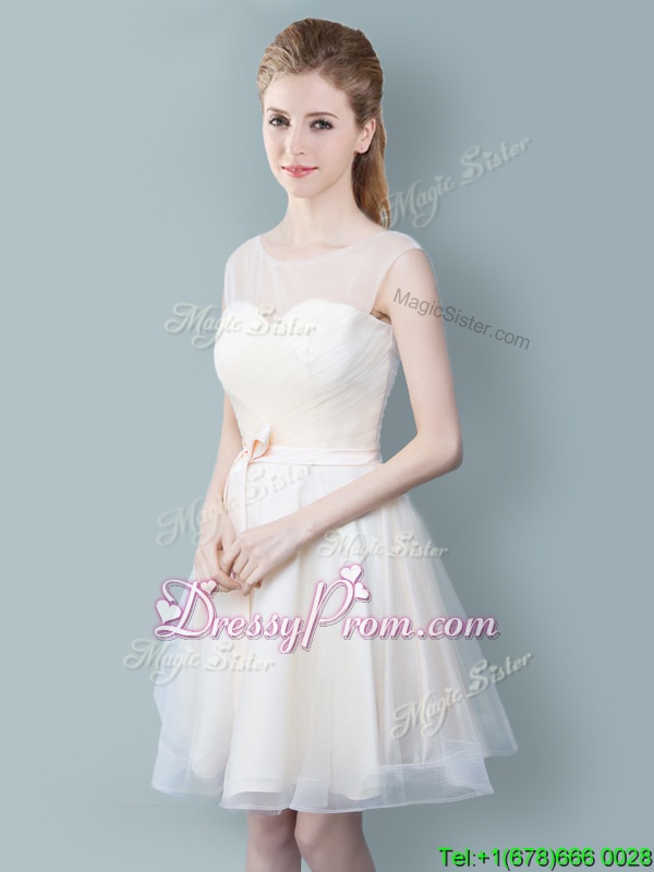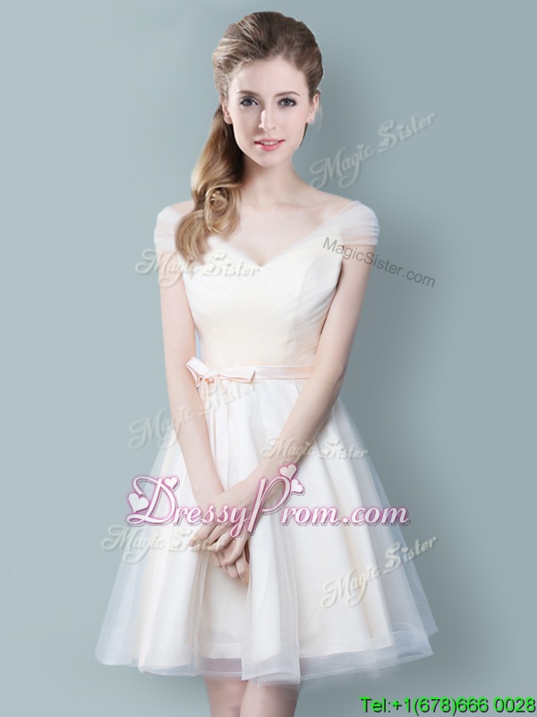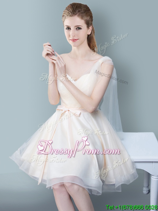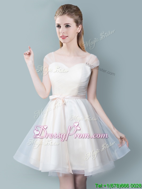 Straps Straps Champagne Tulle Zipper Court Dresses for Sweet 16 Cap Sleeves Knee Length Ruching and Bowknot
