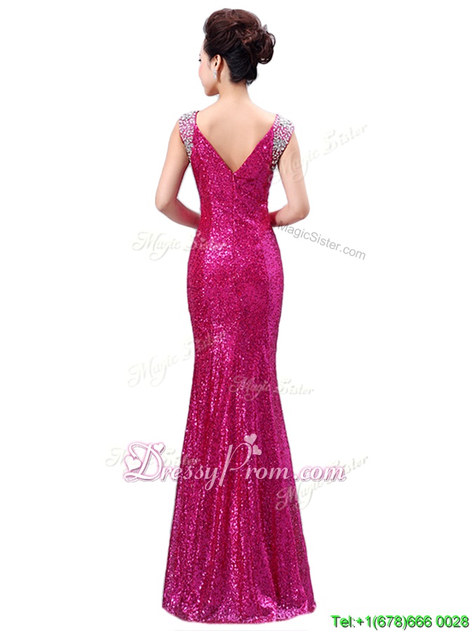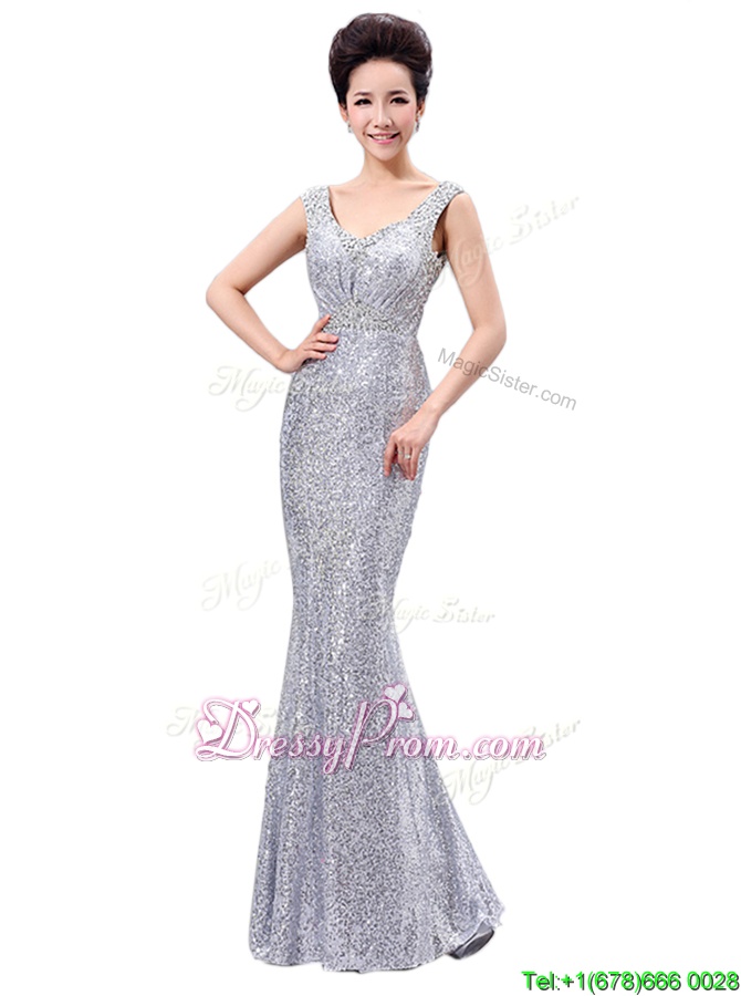 Neckline : V-neckShown Color : SilverSilhouette : Column/SheathSleeve Length : sleevelessHemline : floor lengthBack Detail : ZipperFabric : SequinedEmbellishment : SequinsOccasion : Prom,PartySeason : Spring,Summer,Fall,Winter