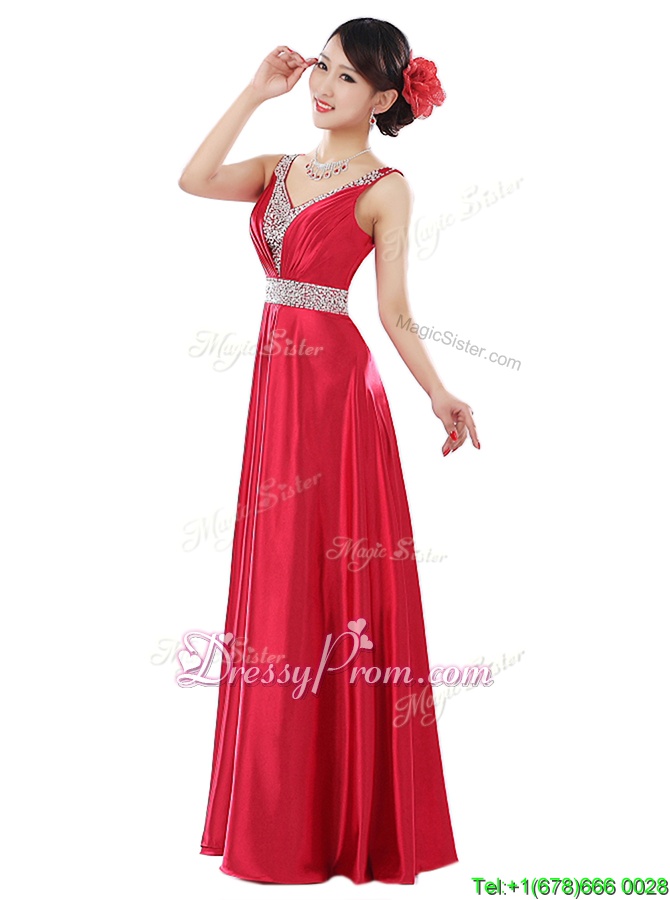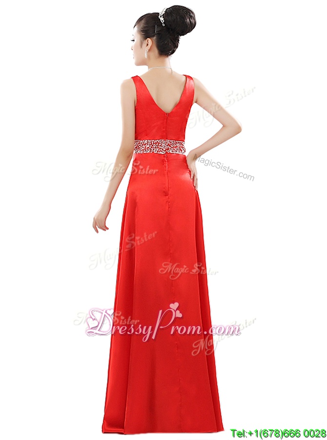 Neckline : V-neckShown Color : Coral RedSilhouette : EmpireSleeve Length : sleevelessHemline : floor lengthBack Detail : ZipperFabric : Elastic Woven SatinEmbellishment : BeadingOccasion : Prom,PartySeason : Spring,Summer,Fall,Winter