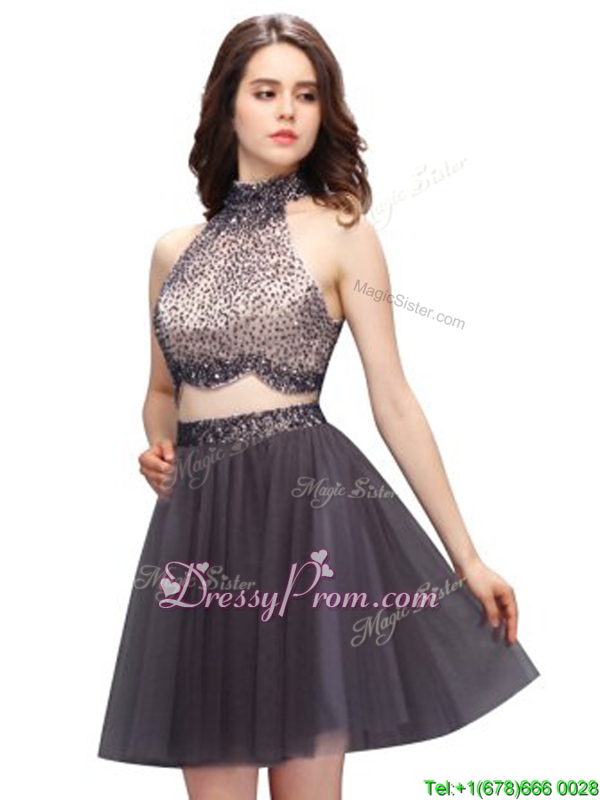Neckline : High-neckShown Color : BlackSilhouette : Two PiecesSleeve Length : sleevelessHemline : mini lengthBack Detail : ZipperFabric : ChiffonEmbellishment : BeadingOccasion : Prom,PartySeason : Spring,Summer,Fall,Winter