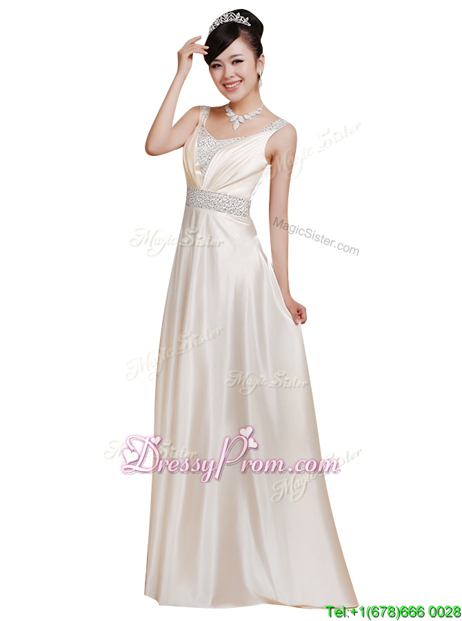 Neckline : V-neckShown Color : WhiteSilhouette : EmpireSleeve Length : sleevelessHemline : floor lengthBack Detail : ZipperFabric : Elastic Woven SatinEmbellishment : BeadingOccasion : Prom,PartySeason : Spring,Summer,Fall,Winter
