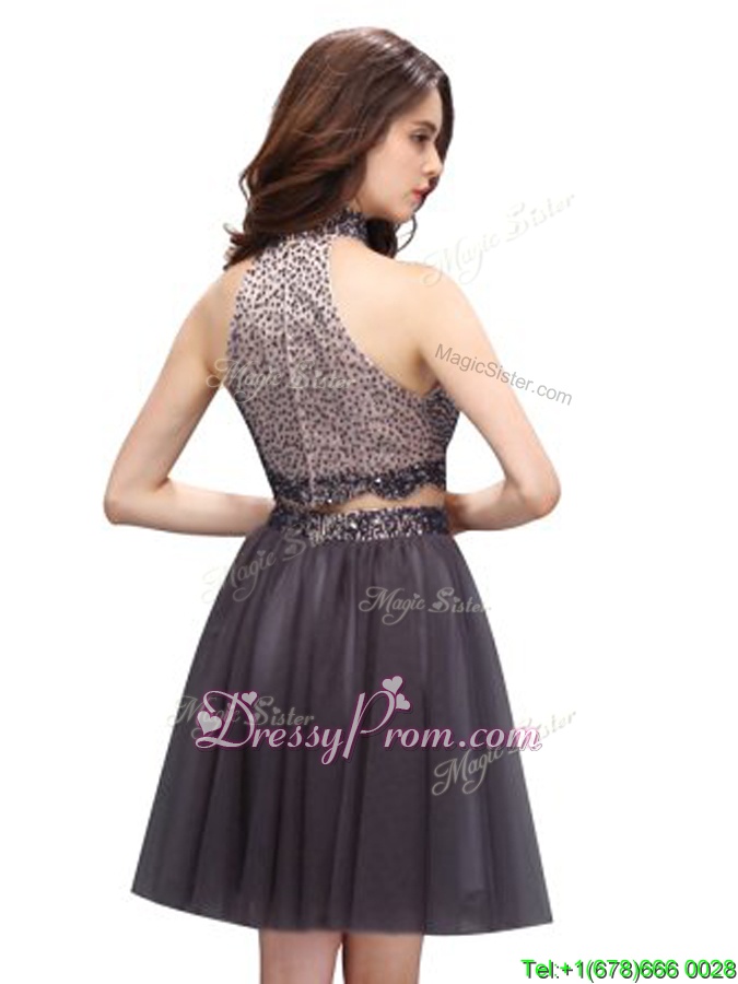 Neckline : High-neckShown Color : BlueSilhouette : Two PiecesSleeve Length : sleevelessHemline : mini lengthBack Detail : ZipperFabric : ChiffonEmbellishment : BeadingOccasion : Prom,PartySeason : Spring,Summer,Fall