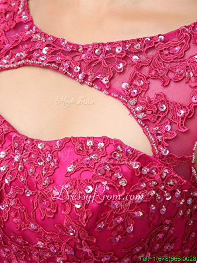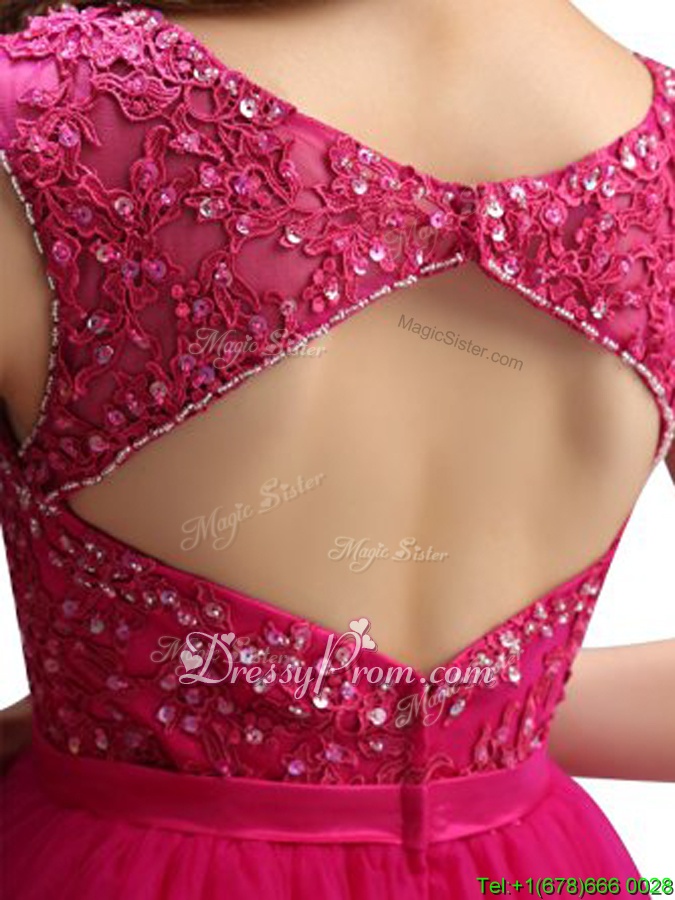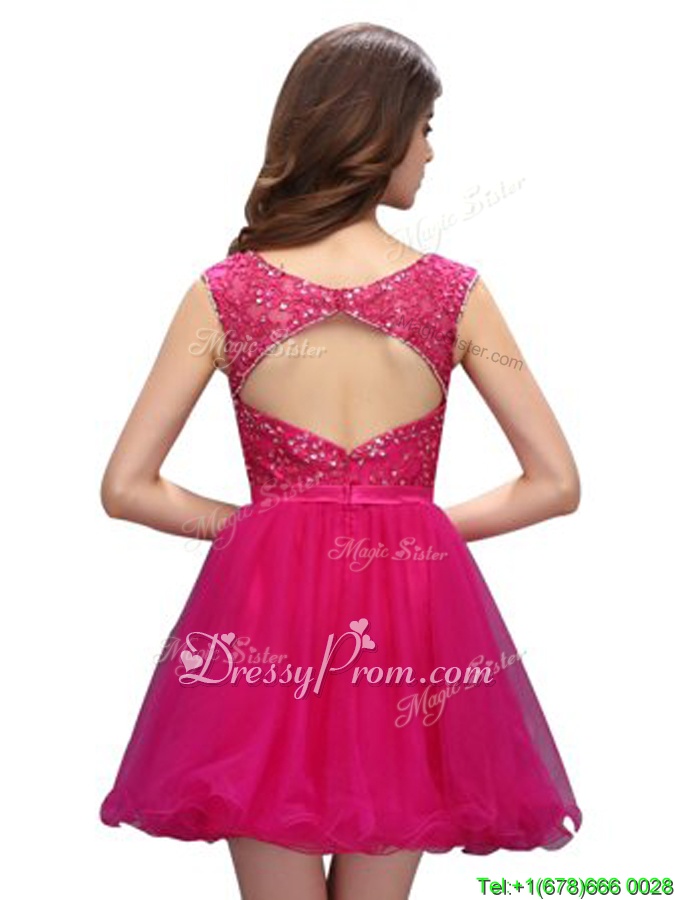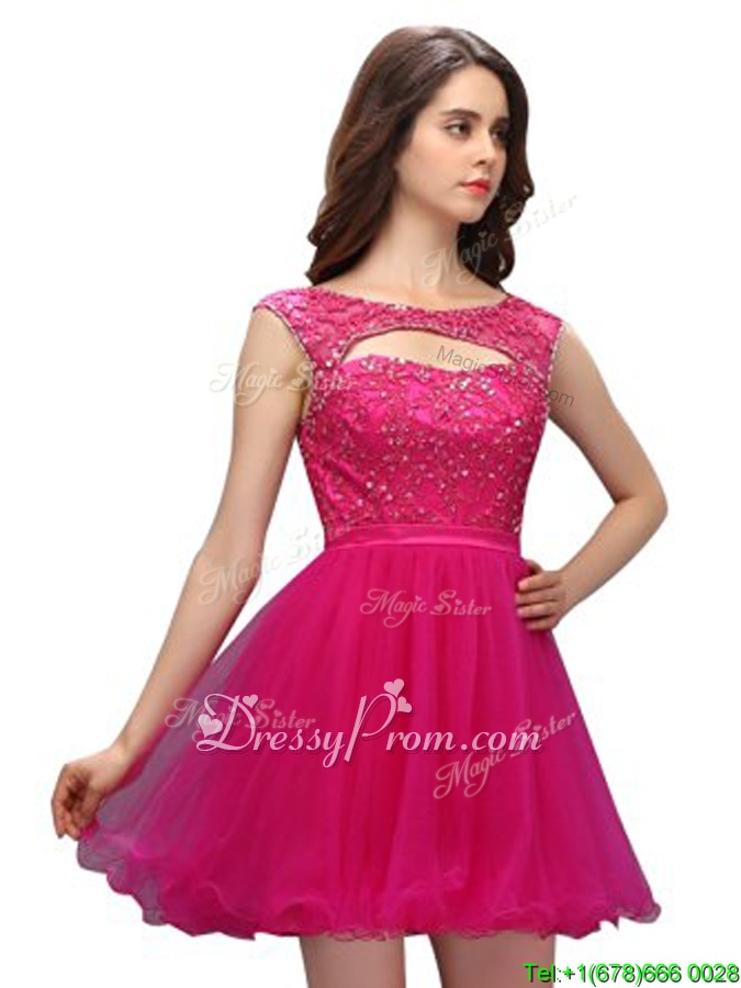 Neckline : BateauShown Color : FuchsiaSilhouette : A-lineSleeve Length : sleevelessHemline : mini lengthBack Detail : ZipperFabric : OrganzaEmbellishment : Beading,AppliquesOccasion : Prom,PartySeason : Spring,Summer,Fall