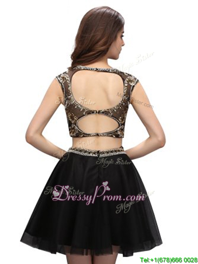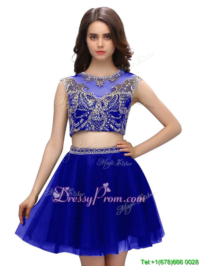 Neckline : ScoopShown Color : BlueSilhouette : Two PiecesSleeve Length : sleevelessHemline : mini lengthBack Detail : Criss crossFabric : TulleEmbellishment : BeadingOccasion : Prom,PartySeason : Spring,Summer,Fall