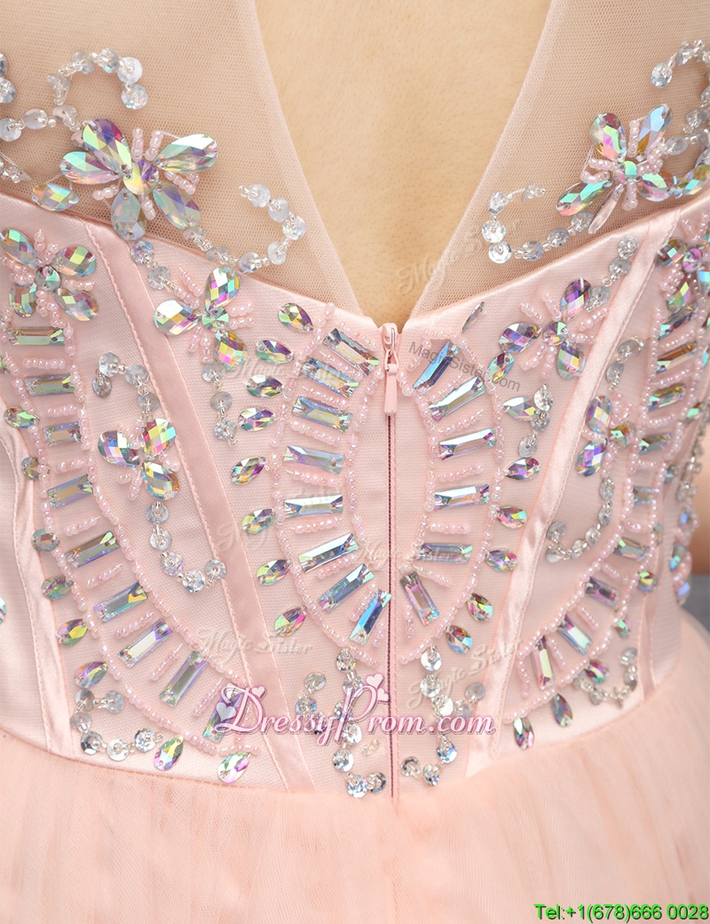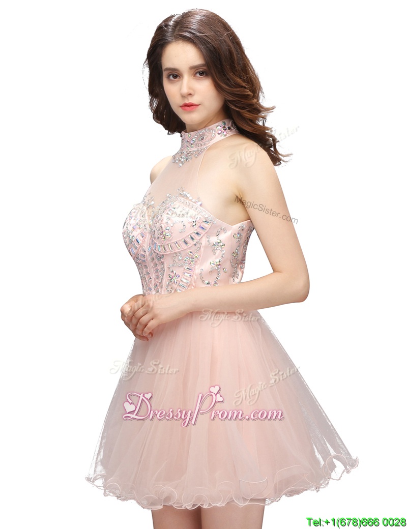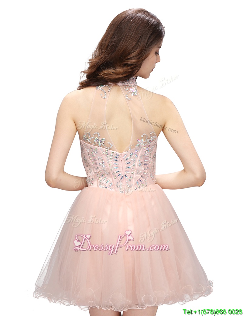 Neckline : High-neckShown Color : Baby PinkSilhouette : A-lineSleeve Length : sleevelessHemline : mini lengthBack Detail : ZipperFabric : OrganzaEmbellishment : BeadingOccasion : Prom,PartySeason : Spring,Summer,Fall