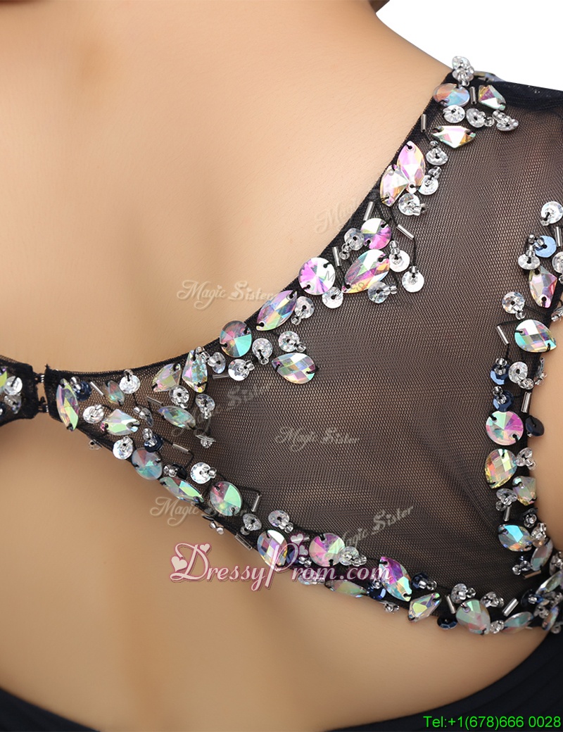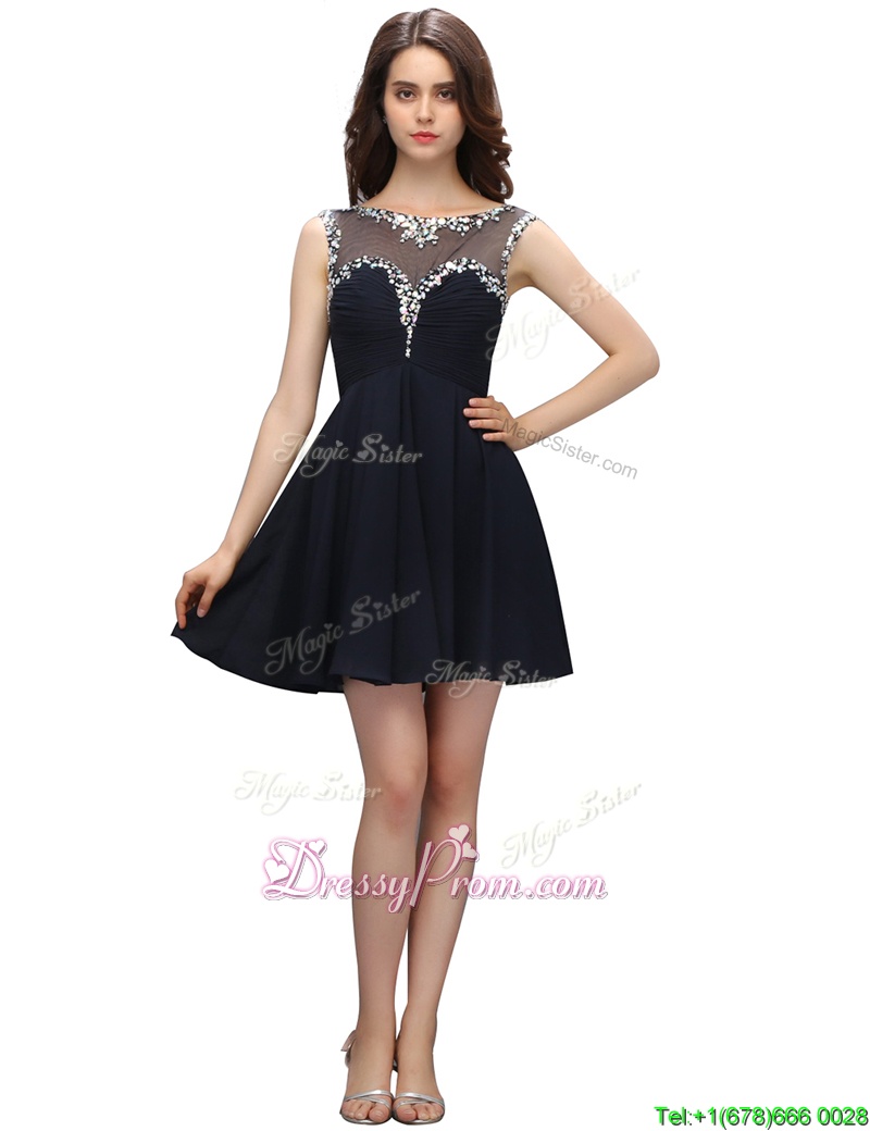 Neckline : BateauShown Color : BlackSilhouette : EmpireSleeve Length : sleevelessHemline : mini lengthBack Detail : ZipperFabric : ChiffonEmbellishment : BeadingOccasion : Prom,PartySeason : Spring,Summer,Fall