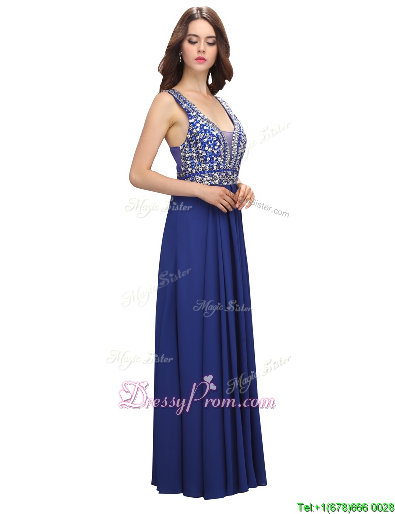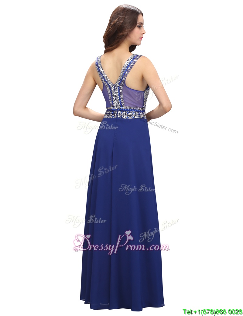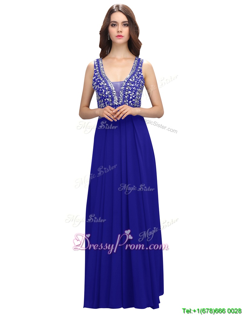 Neckline : StrapsShown Color : Royal BlueSilhouette : EmpireSleeve Length : sleevelessHemline : floor lengthBack Detail : ZipperFabric : ChiffonEmbellishment : BeadingOccasion : Prom,PartySeason : Spring,Summer,Fall,Winter