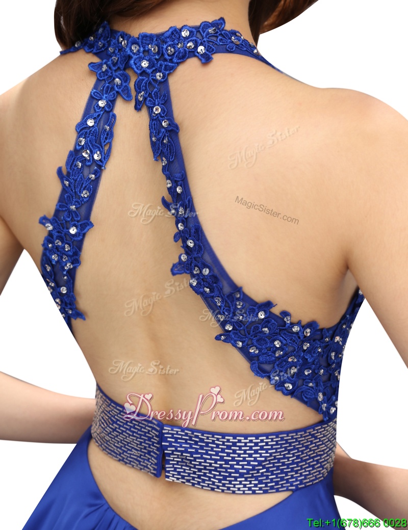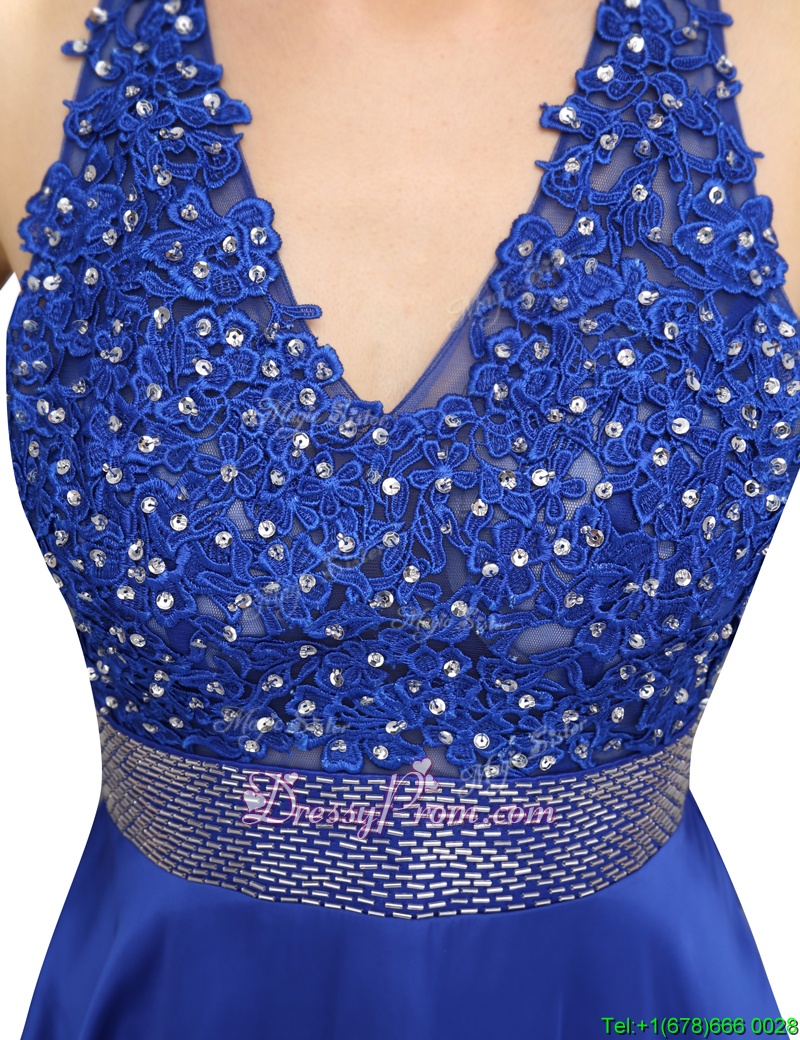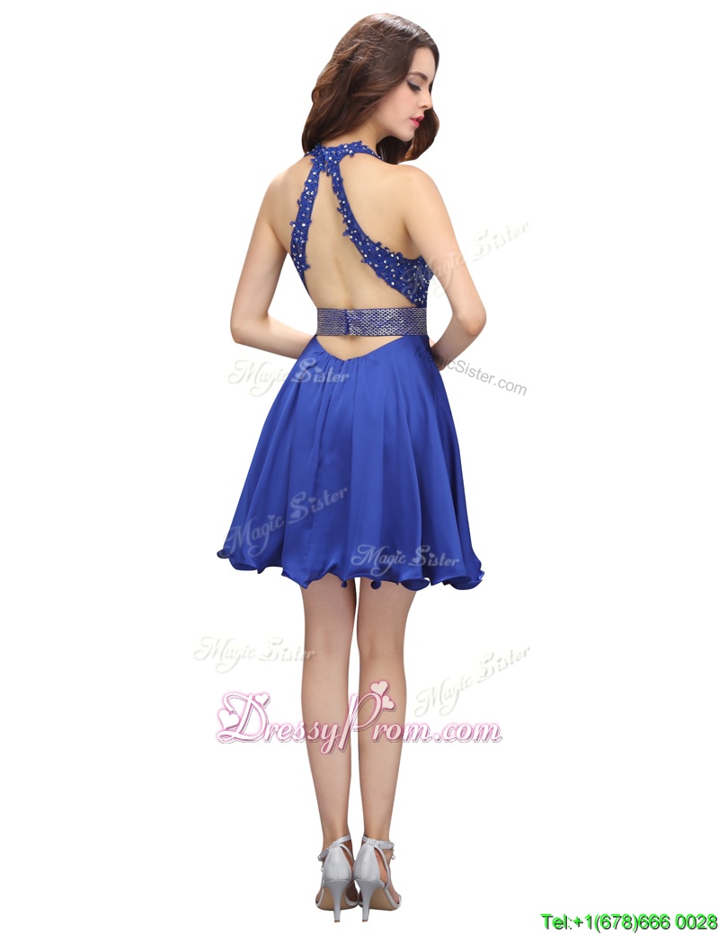 Neckline : V-neckShown Color : Royal BlueSilhouette : EmpireSleeve Length : sleevelessHemline : mini lengthBack Detail : Criss crossFabric : ChiffonEmbellishment : Beading,BeltOccasion : Prom,PartySeason : Spring,Summer,Fall