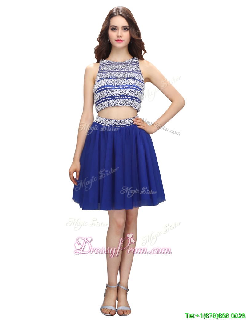 Neckline : ScoopShown Color : Royal BlueSilhouette : EmpireSleeve Length : sleevelessHemline : knee lengthBack Detail : BacklessFabric : ChiffonEmbellishment : BeadingOccasion : Prom,PartySeason : Spring,Summer,Fall