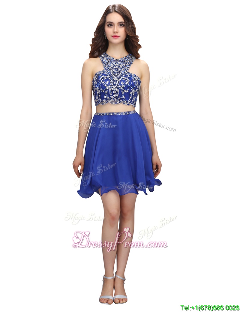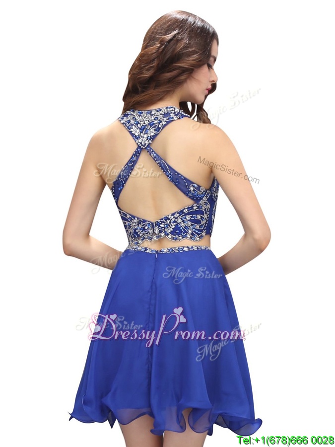 Neckline : ScoopShown Color : Royal BlueSilhouette : EmpireSleeve Length : sleevelessHemline : knee lengthBack Detail : Criss crossFabric : OrganzaEmbellishment : BeadingOccasion : Prom,PartySeason : Spring,Summer,Fall