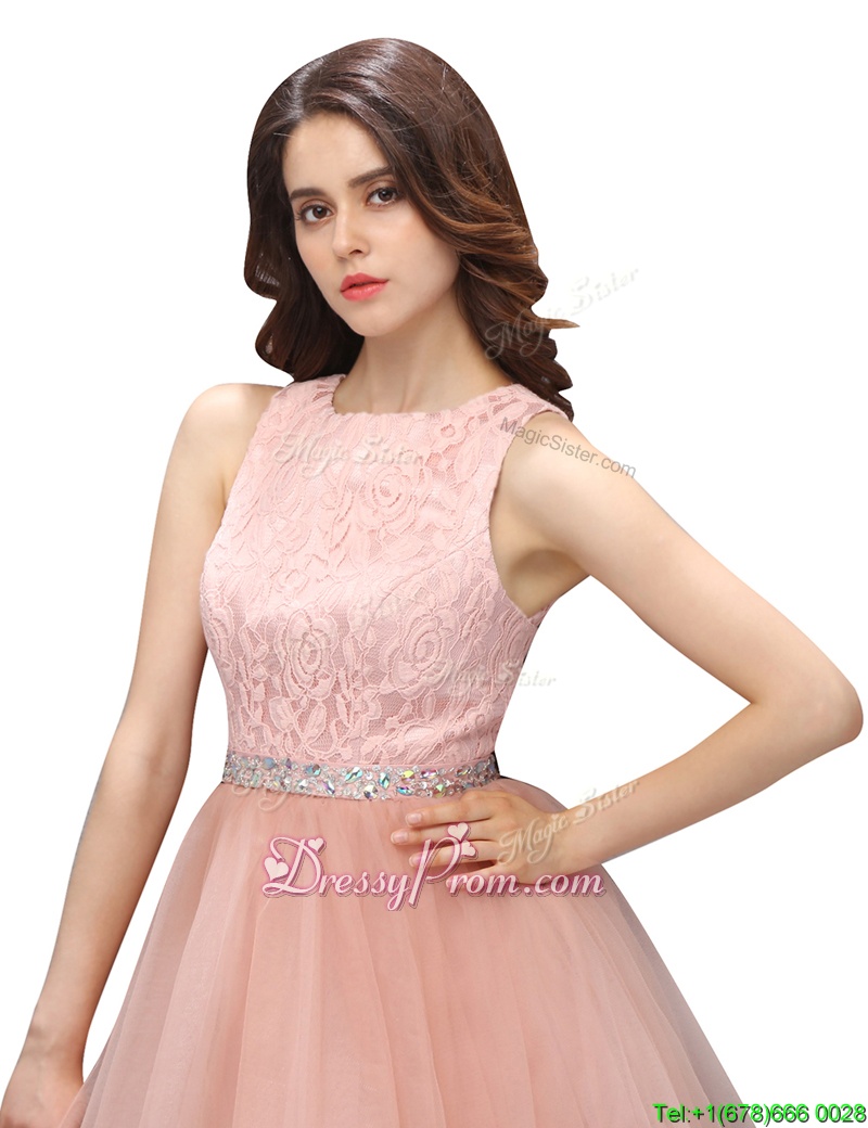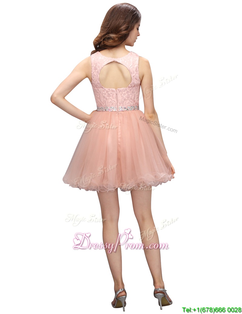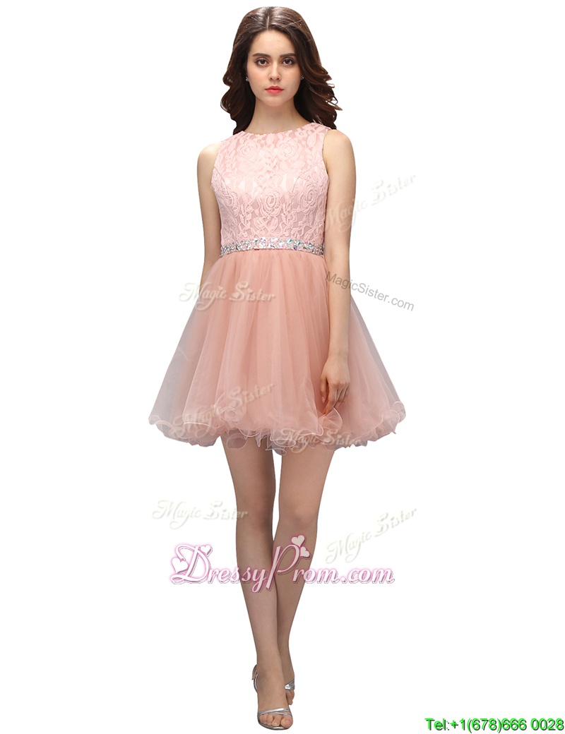 Neckline : ScoopShown Color : PinkSilhouette : A-lineSleeve Length : sleevelessHemline : mini lengthBack Detail : ZipperFabric : OrganzaEmbellishment : Beading,LaceOccasion : Prom,PartySeason : Spring,Summer,Fall