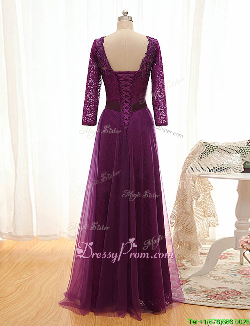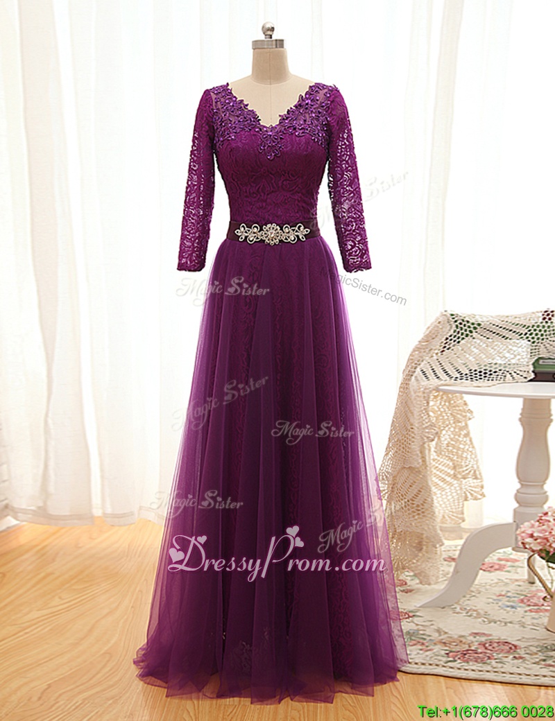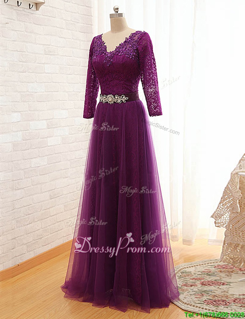 Neckline : V-neckShown Color : PurpleSilhouette : EmpireSleeve Length : 3|4 length sleeveHemline : floor lengthBack Detail : Lace upFabric : TulleEmbellishment : Beading,LaceOccasion : Prom,PartySeason : Spring,Summer,Fall,Winter