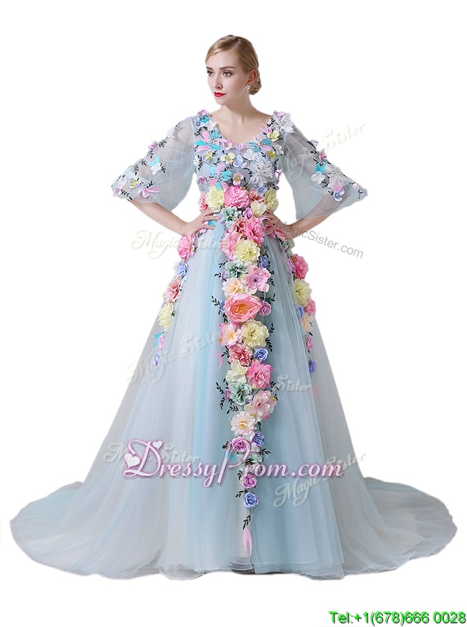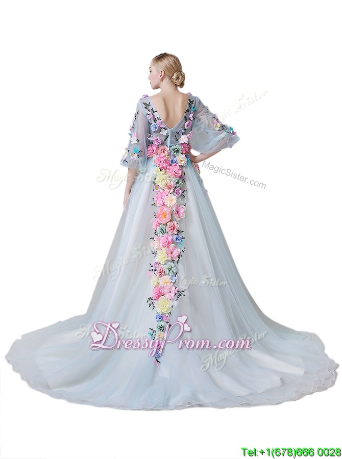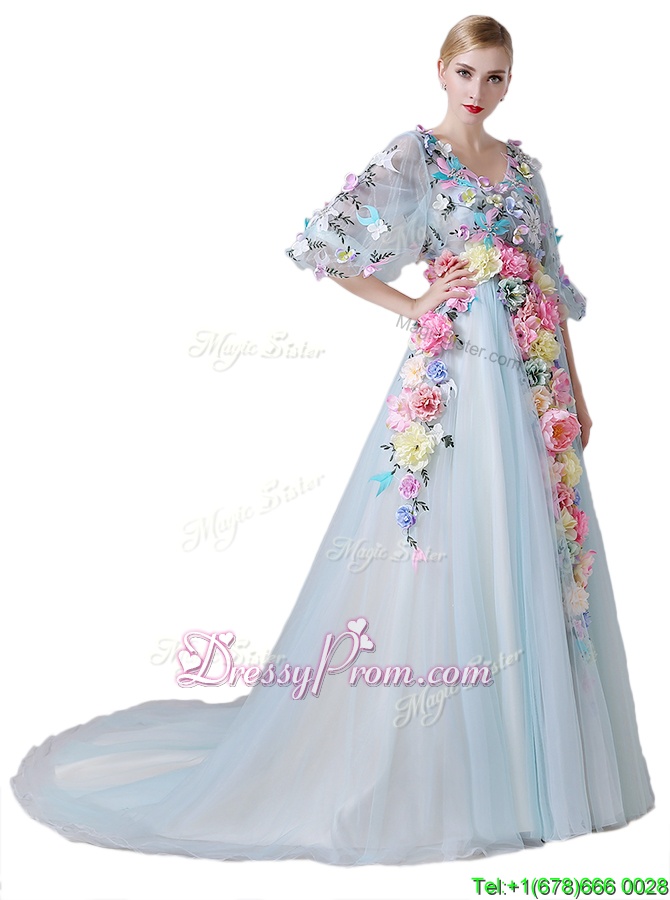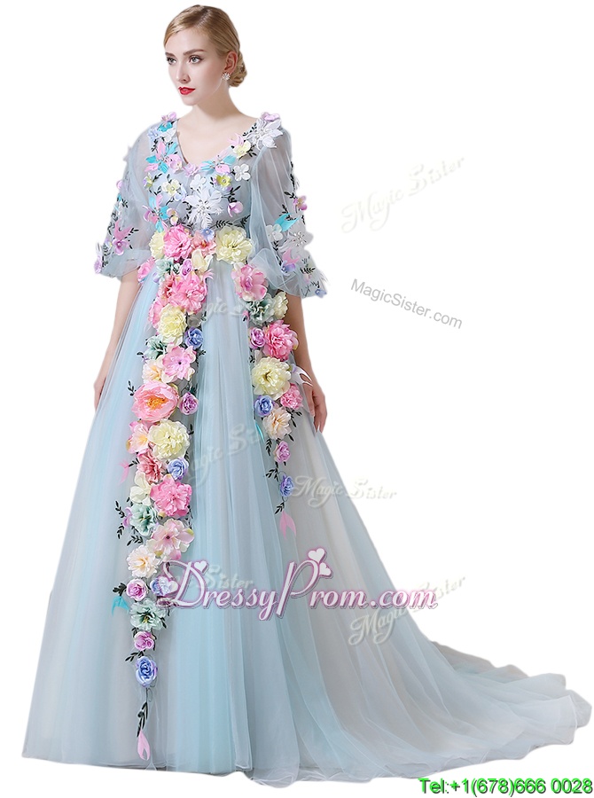 Neckline : V-neckShown Color : Light BlueSilhouette : A-lineSleeve Length : half sleevesHemline : with trainBack Detail : ZipperFabric : TulleEmbellishment : Hand Made FlowerOccasion : Prom,PartySeason : Spring,Summer,Fall,Winter