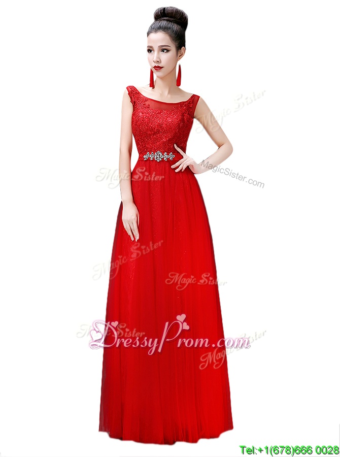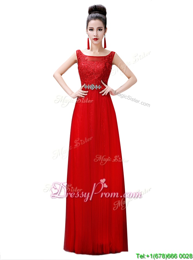 Neckline : BateauShown Color : RedSilhouette : EmpireSleeve Length : sleevelessHemline : floor lengthBack Detail : ZipperFabric : ChiffonEmbellishment : Beading,LaceOccasion : Prom,PartySeason : Spring,Summer,Fall,Winter