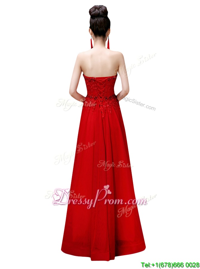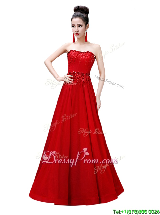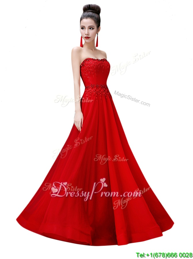 Neckline : StraplessShown Color : RedSilhouette : EmpireSleeve Length : sleevelessHemline : floor lengthBack Detail : Lace upFabric : ChiffonEmbellishment : BeadingOccasion : Prom,PartySeason : Spring,Summer,Fall,Winter