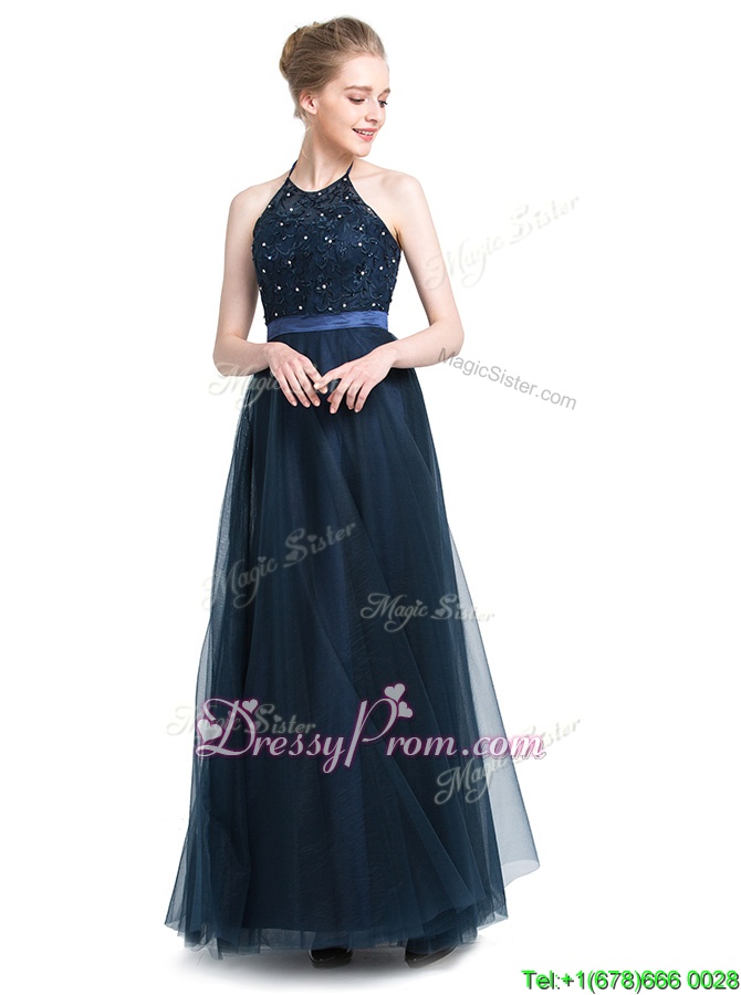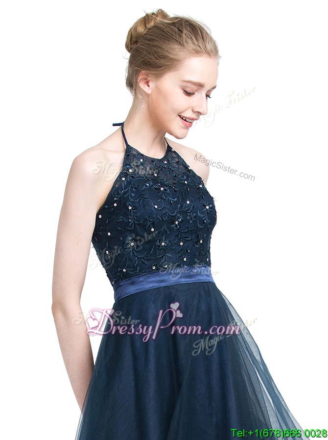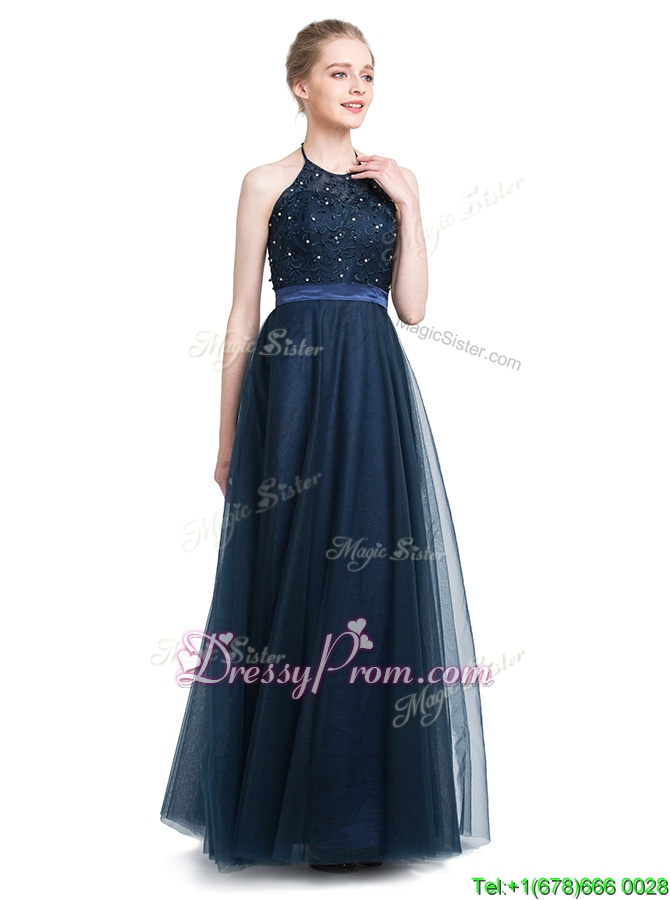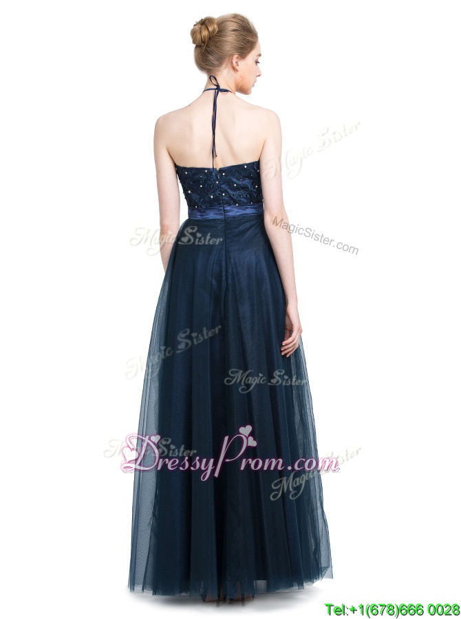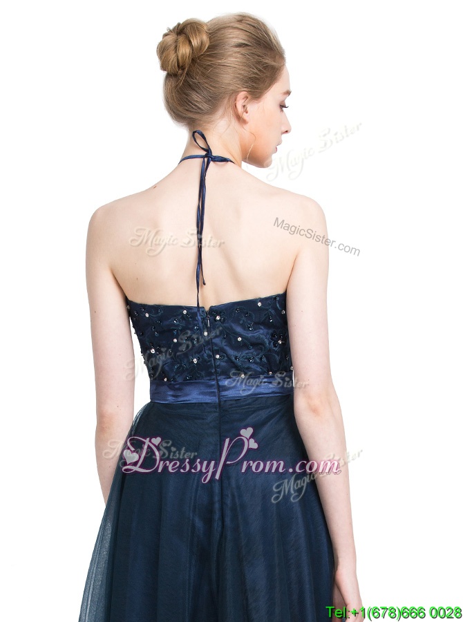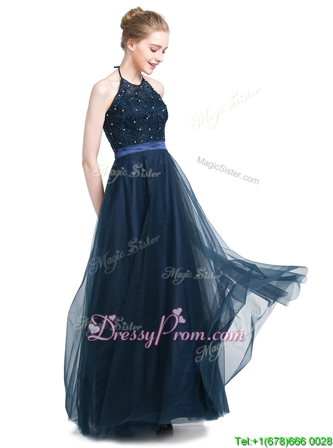 Neckline : Halter topShown Color : Navy BlueSilhouette : EmpireSleeve Length : sleevelessHemline : floor lengthBack Detail : ZipperFabric : TulleEmbellishment : BeadingOccasion : Prom,PartySeason : Spring,Summer,Fall,Winter