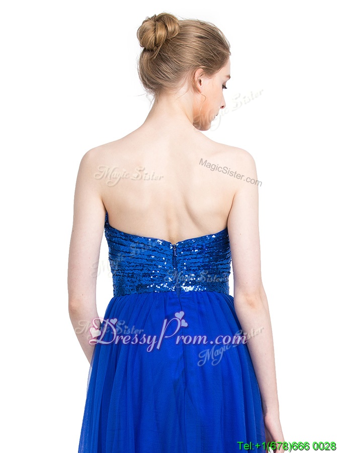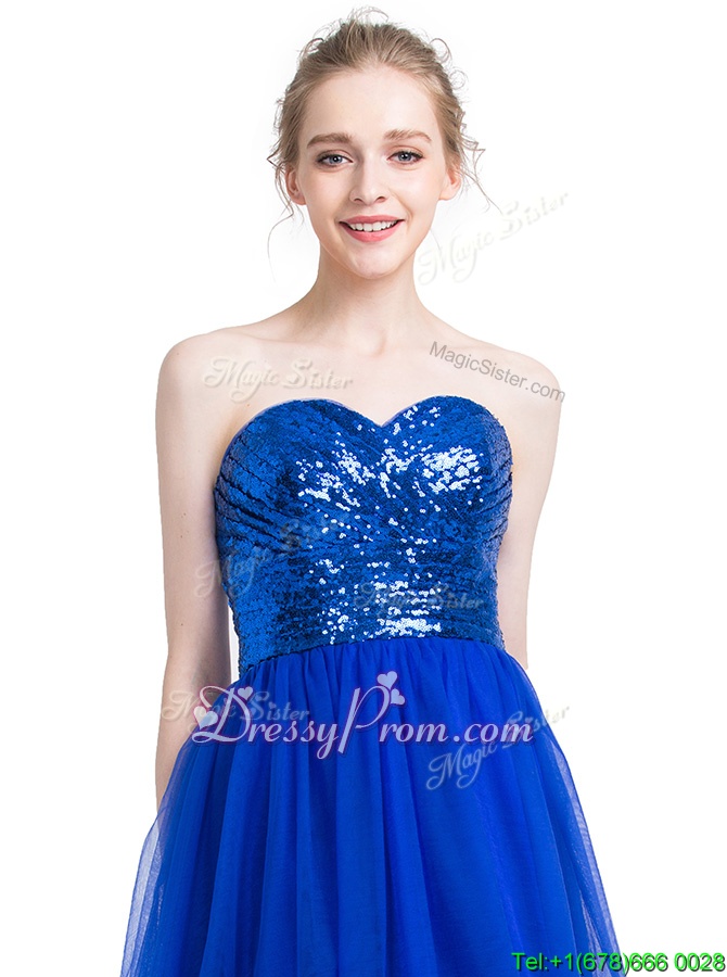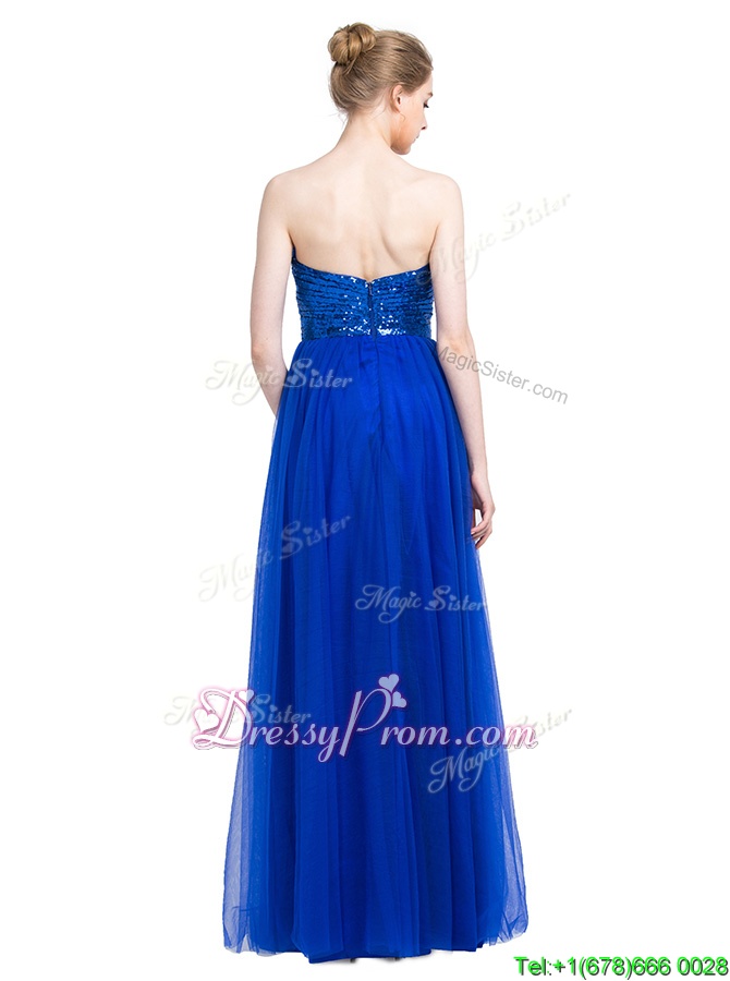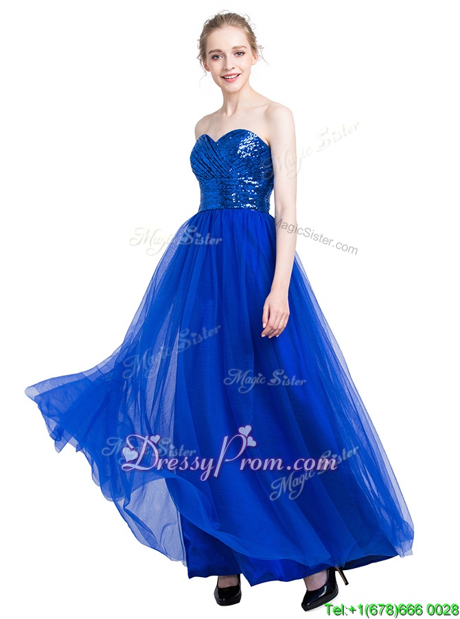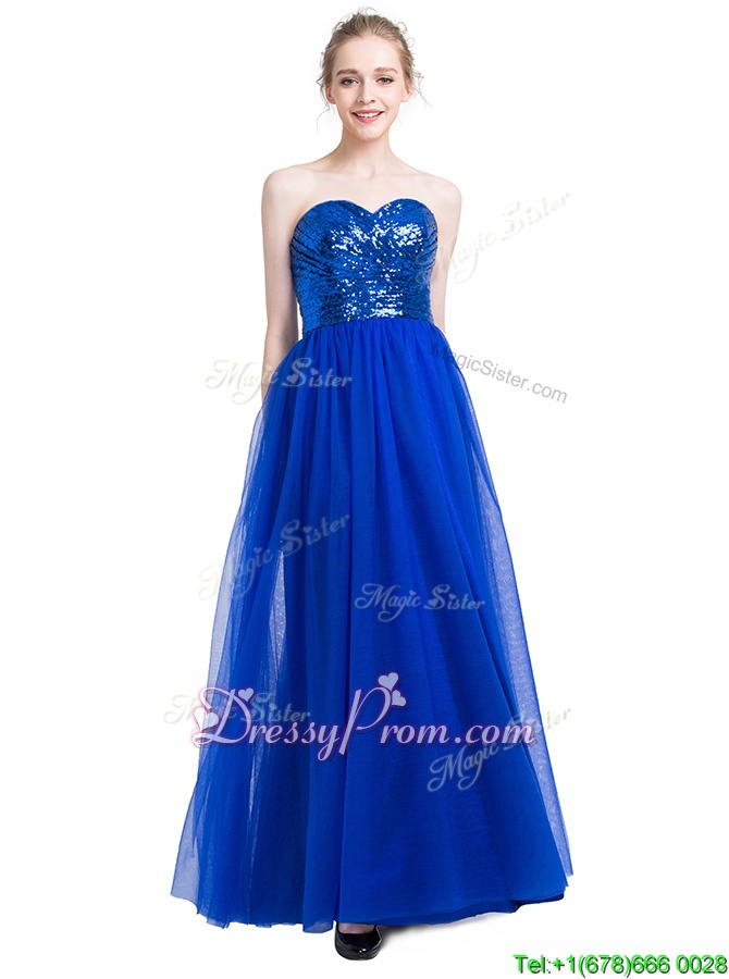 Neckline : SweetheartShown Color : Royal BlueSilhouette : EmpireSleeve Length : sleevelessHemline : floor lengthBack Detail : ZipperFabric : TulleEmbellishment : SequinsOccasion : Prom,PartySeason : Spring,Summer,Fall,Winter